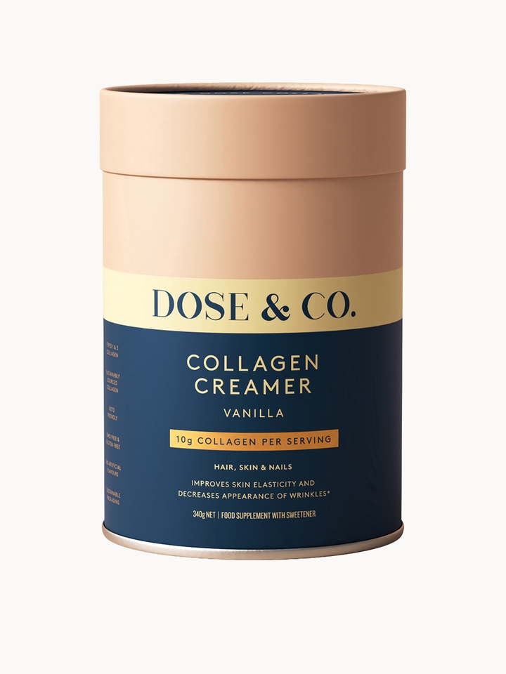 Dose & Co’s Collagen Creamer gives your coffees, smoothies and favourite dessert recipes an extra nourishing kick.Made palatable with natural sweetener stevia and 10 grams of sustainable-sourced bovine collagen per serving, which is measured according to body weight. Deliciously creamy thanks to added whole milk and whey powders, the vanilla-flavoured powder replenishes your body with bioavailable collagen, a naturally-occurring building block of proteins, fundamental in bone, tissue and skin.