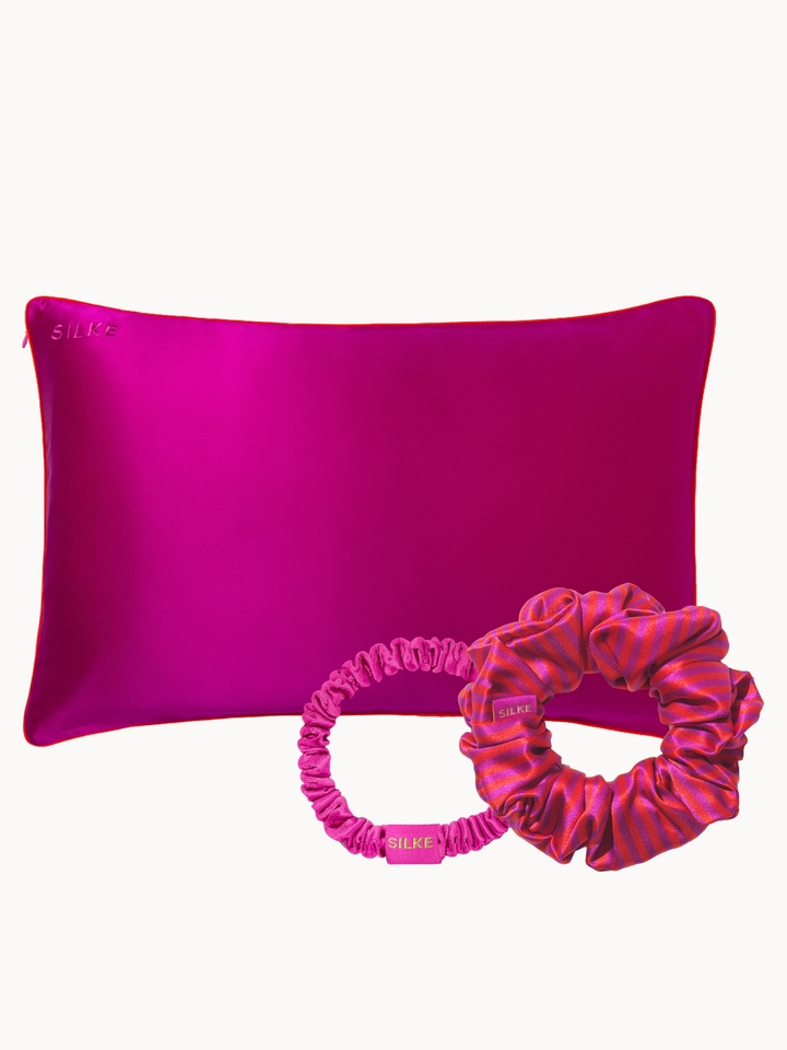 The SILKE 24/7 Set transforms your everyday routine into a ritual of indulgence. Crafted from the finest 22 momme mulberry silk, each piece cocoons your hair and skin in lasting softness. The cool, cloud-like pillowcase preserves hydration and smooths while you sleep, while the scrunchie and silk-wrapped hair tie secure styles with gentle strength, never tugging or creasing. From morning to midnight, your beauty is protected, perfected and wrapped in pure silk luxury. Set contents: Pillowcase Large scrunchie Hair tie