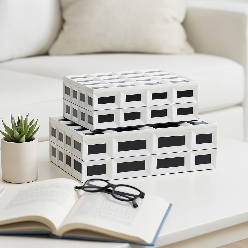 Decorative Checkered Pattern Box with Lid - Set of 2, 10", 12" White - 12.25"