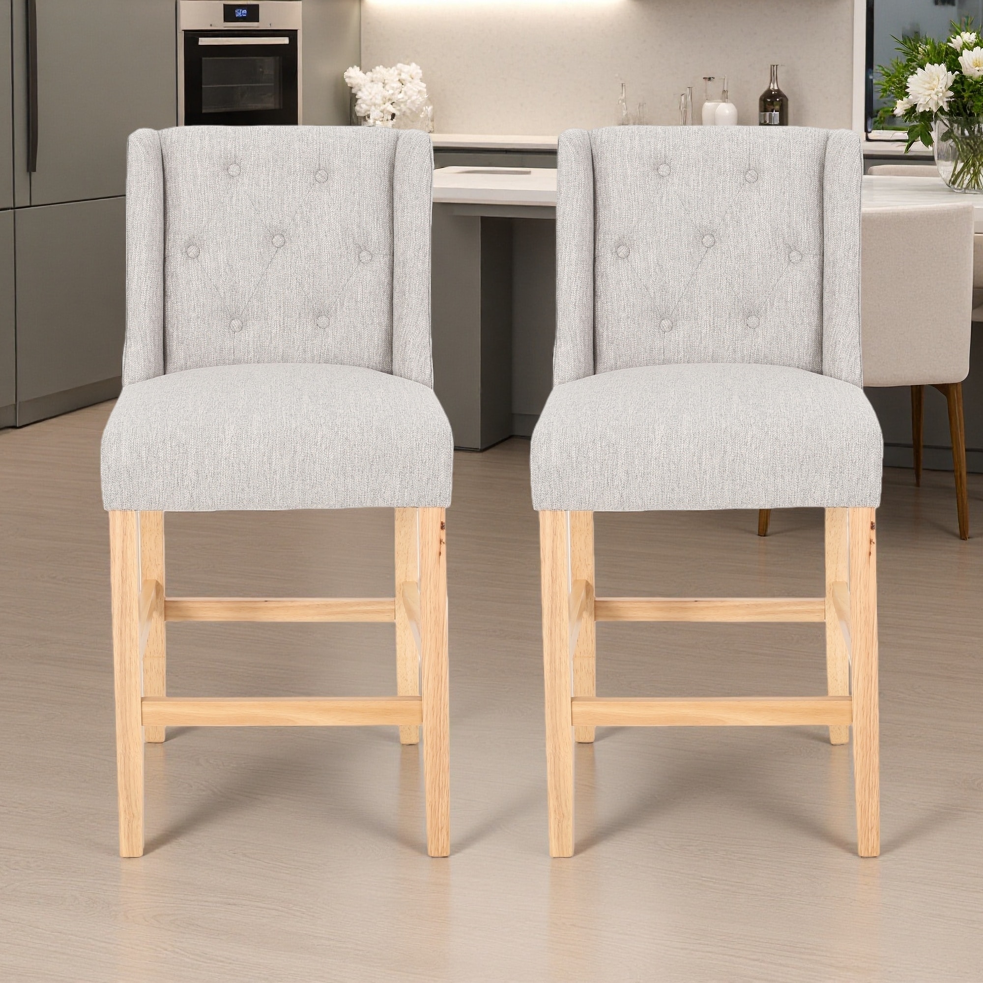 27" Fabric Wingback Counter Stools Set of 2 with Button Tufted Back and Rubberwood Frame