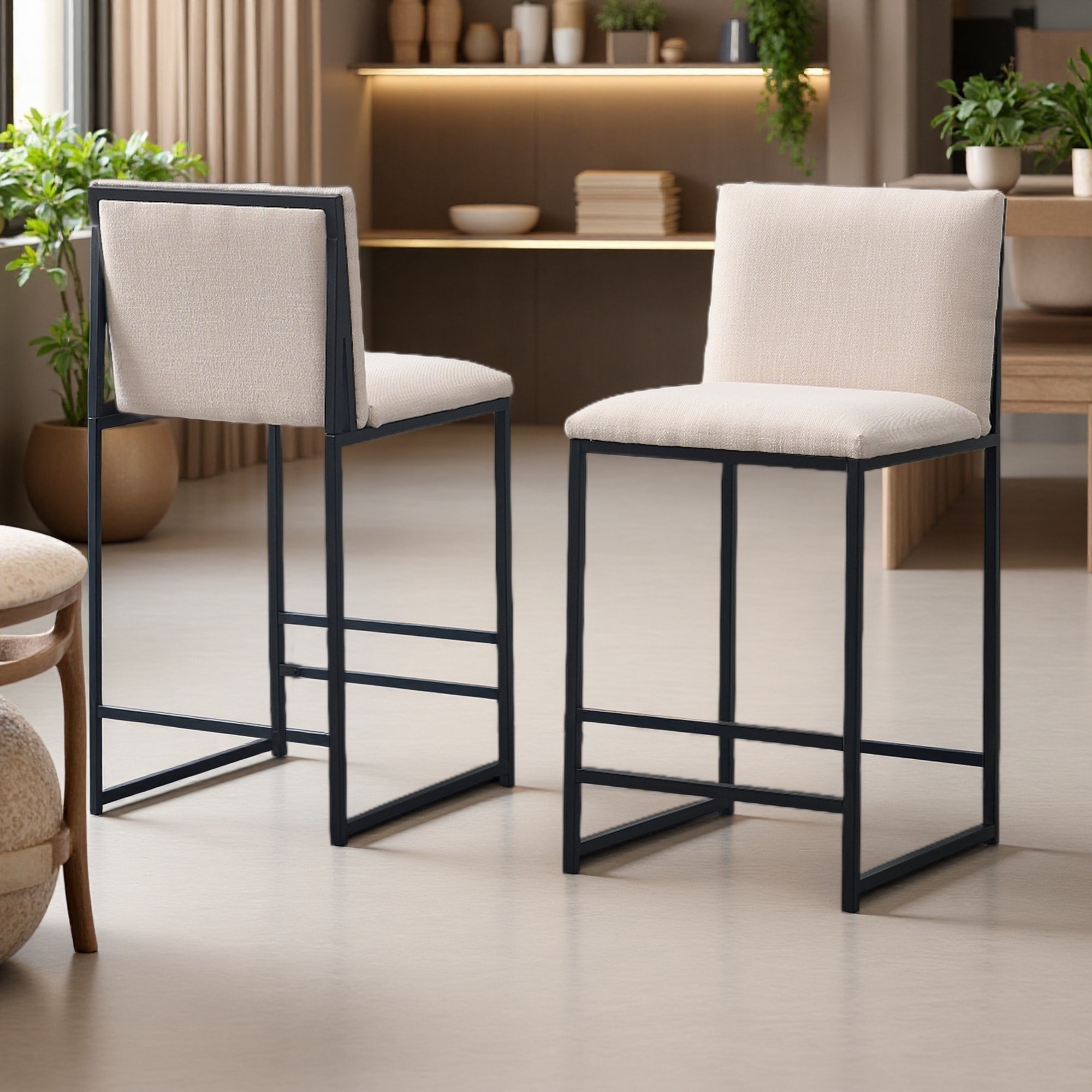 Upholstered Linen Counter Height Bar Stools with Metal Frame and Footrest, Set of 2