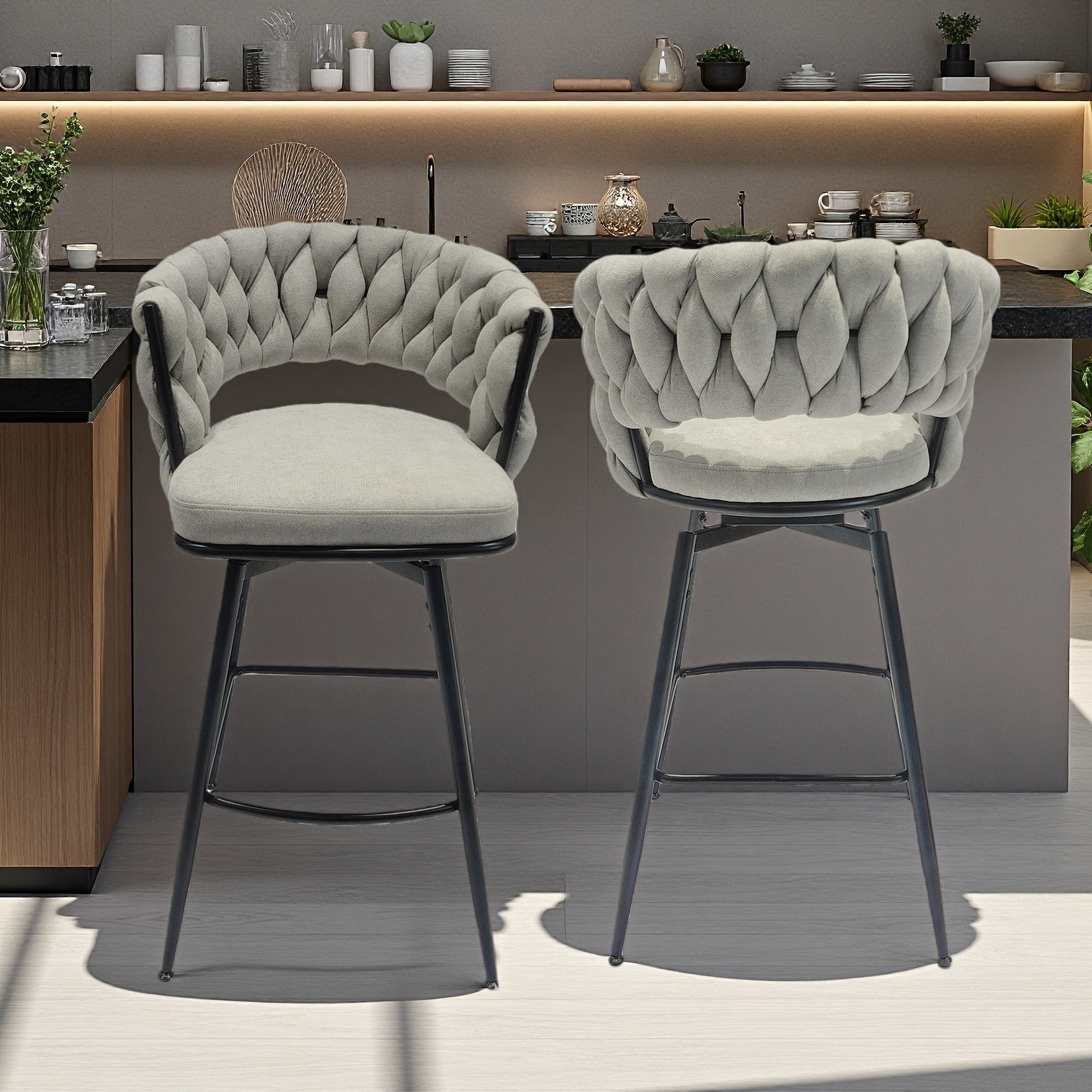 28" Linen Woven Swivel Bar Stools Set of 2 with Backrest, Footrest and Metal Legs