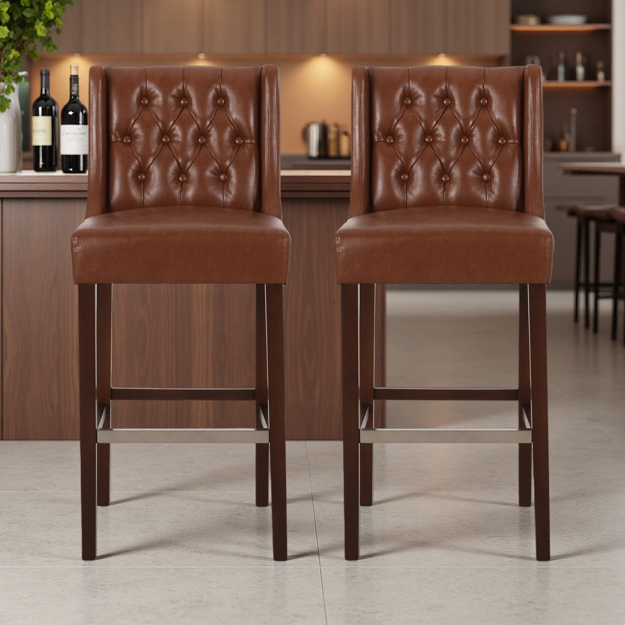 Maddie Upholstered 26" Walnut Wood Counter Stool in Brown Faux Leather