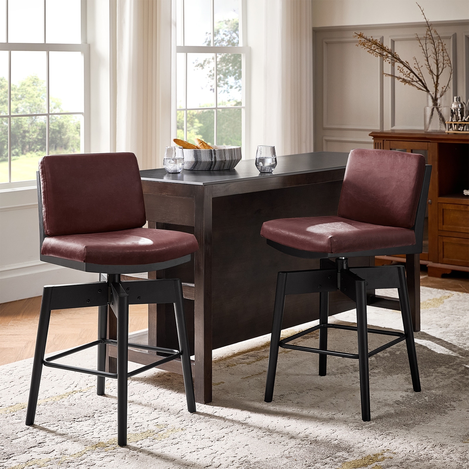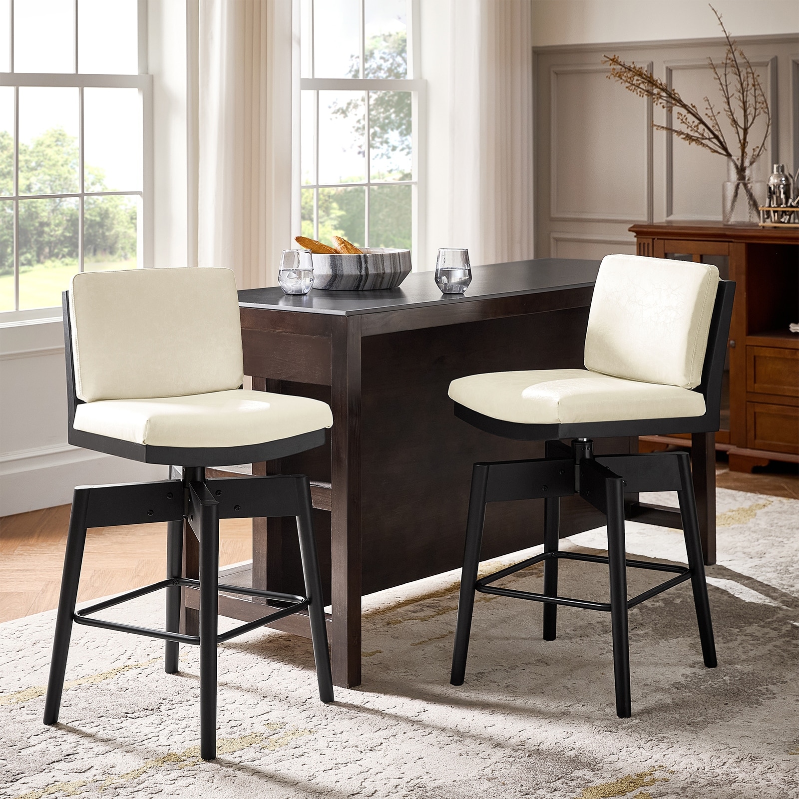 Rodney Modern PU Leather Swivel Bar stool with Removable Back Cushion and Solid wood Legs Set of 2 By HULALA HOME