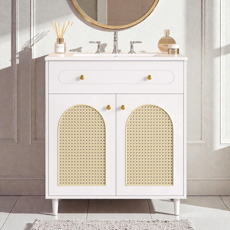 30" Bathroom Vanity with Ceramic Sink, Solid Wood Cabinet, Adjustable Shelf, Tip-Drawer & Rattan Panels