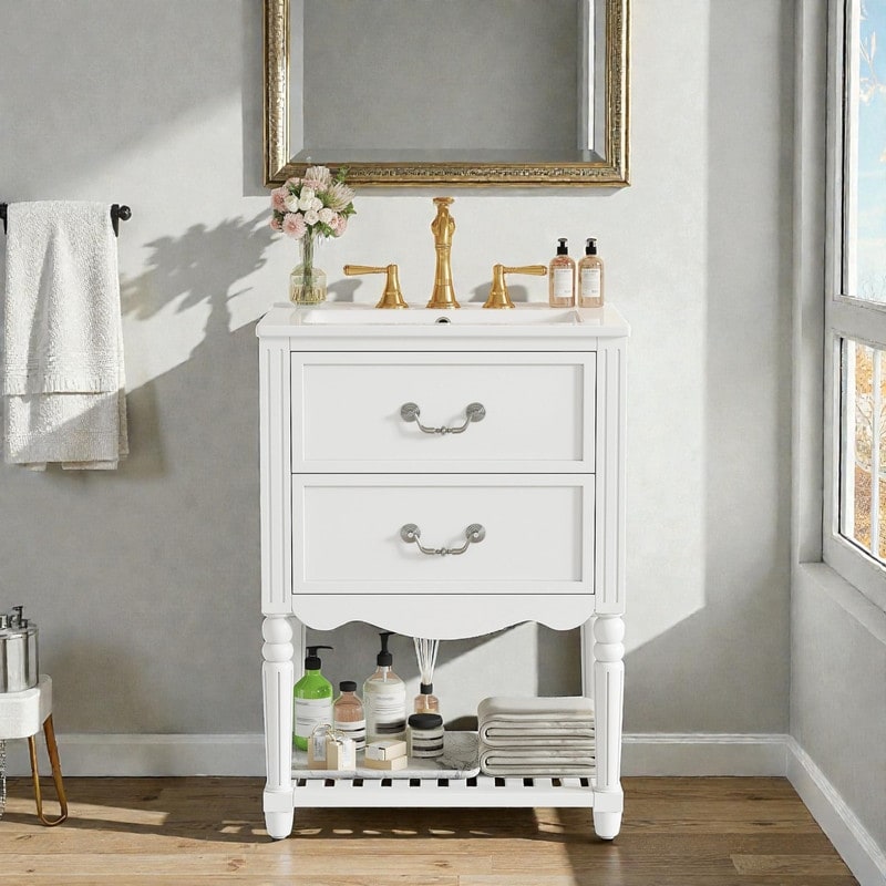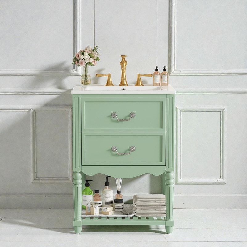 24'' Vintage Bathroom Vanity with Ceramic Sink, Freestanding Cabinet with 2 Drawers, Open Shelf