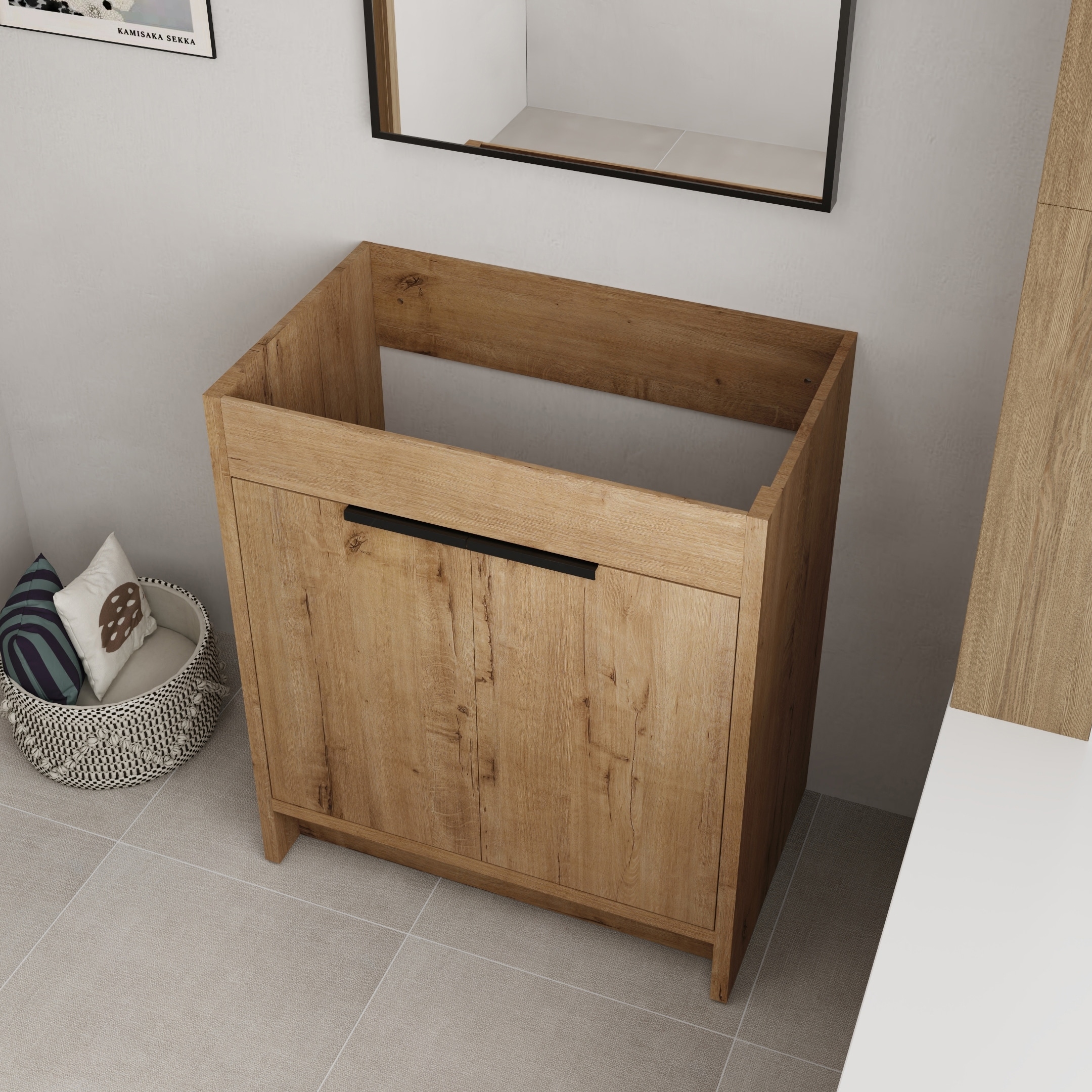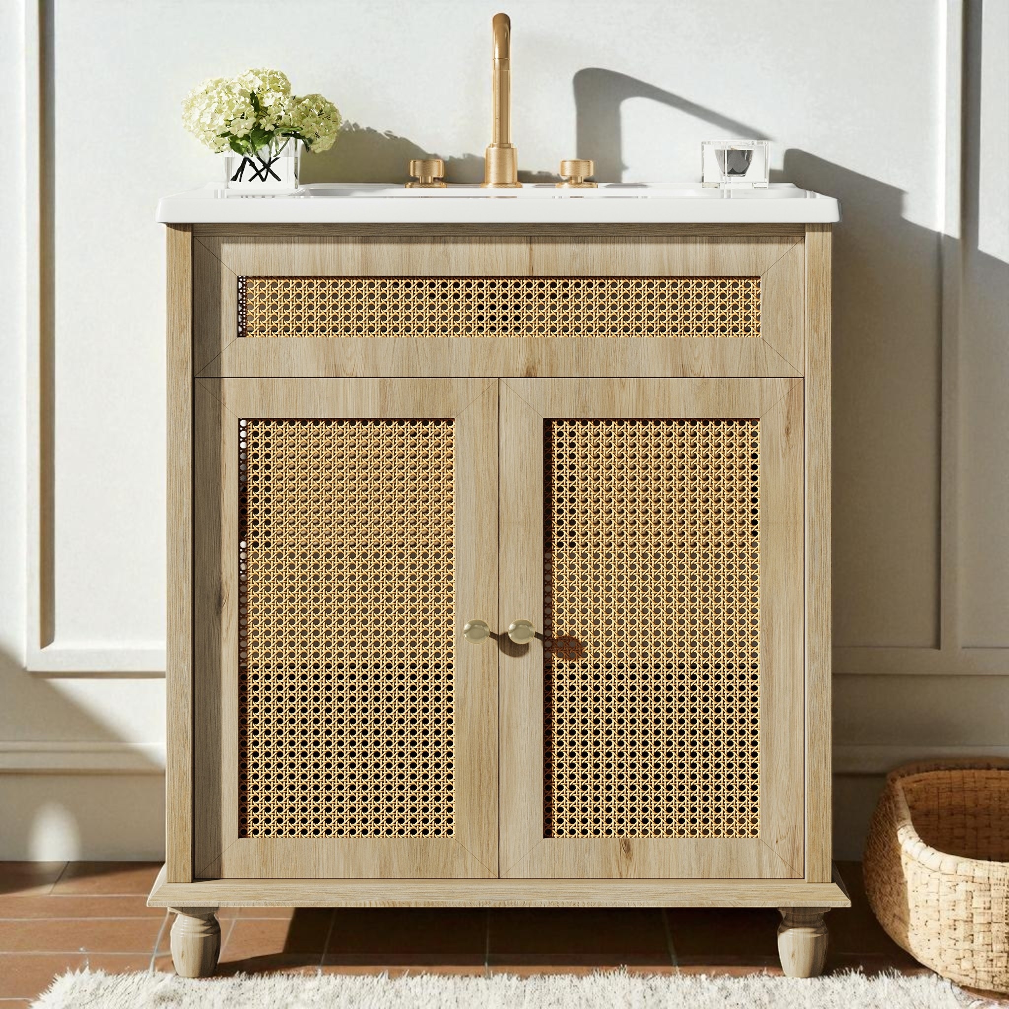 30" Bathroom Vanity with Resin Sink Handwoven Rattan Doors Soft Close Hinges Solid Wood Base