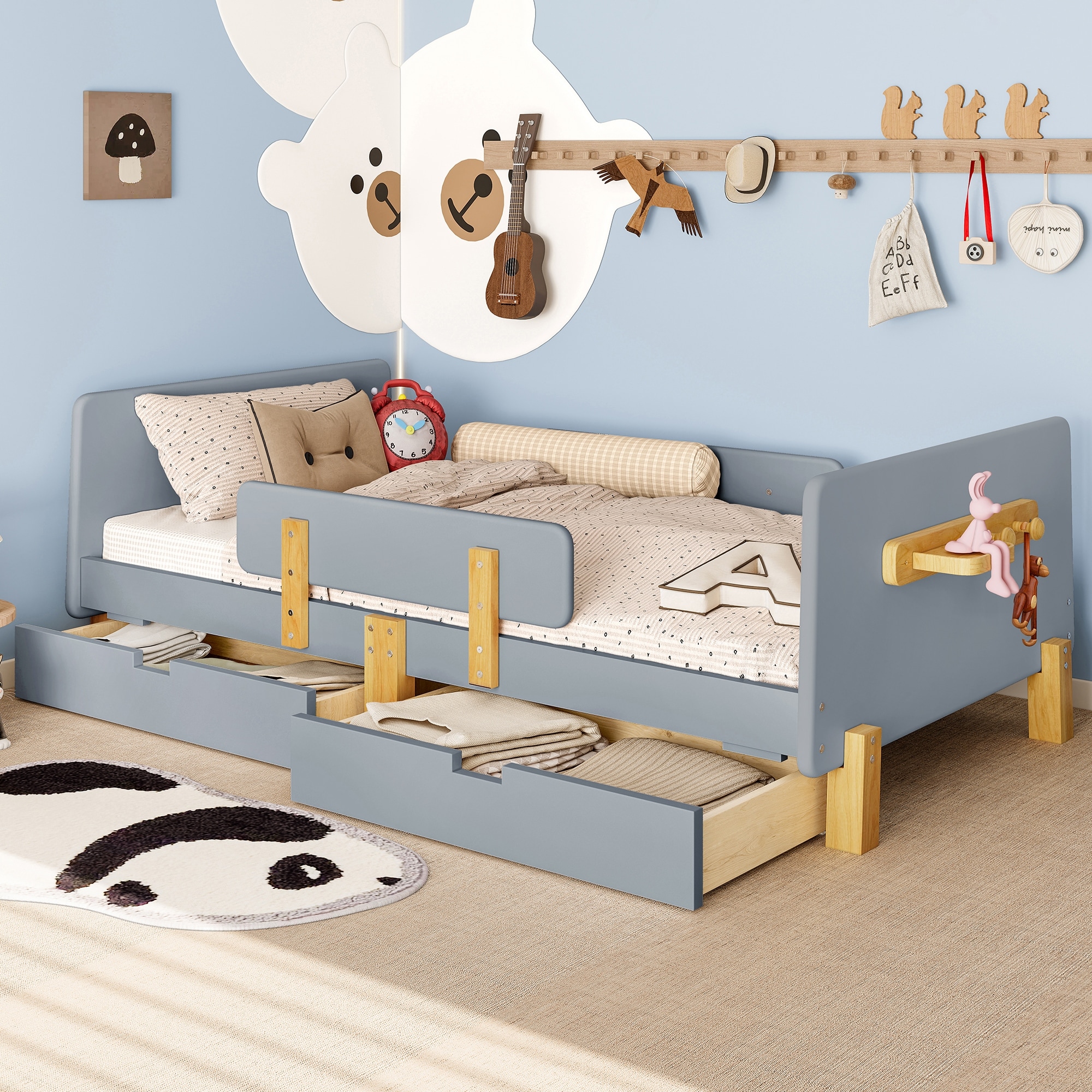 Roomfitters Platform Bed with Storage Drawers and Shelf, Solid Wood Frame with Hooks and Guardrails