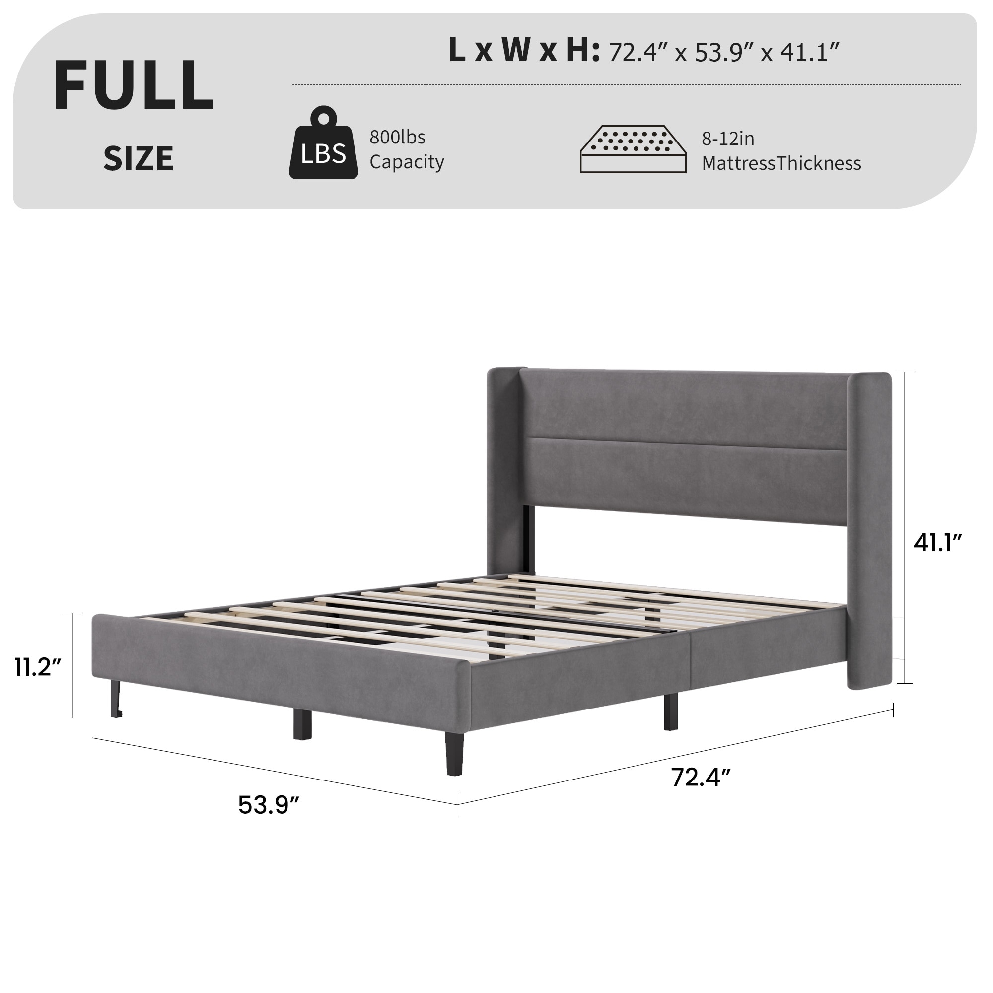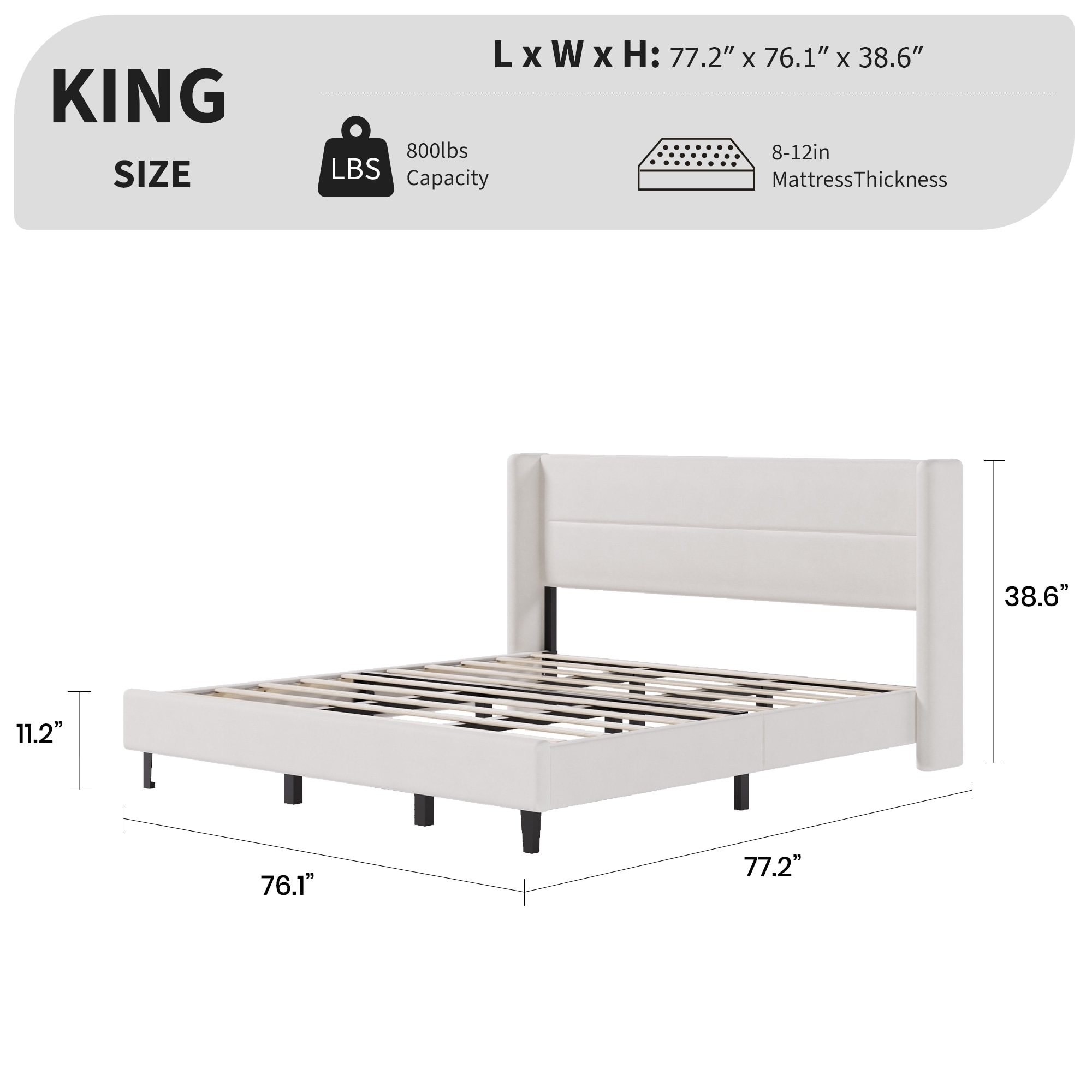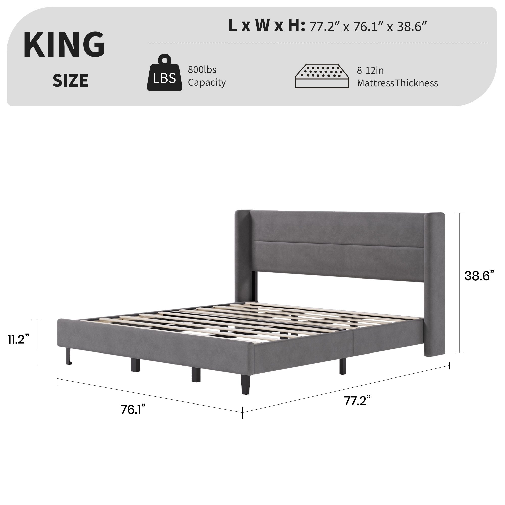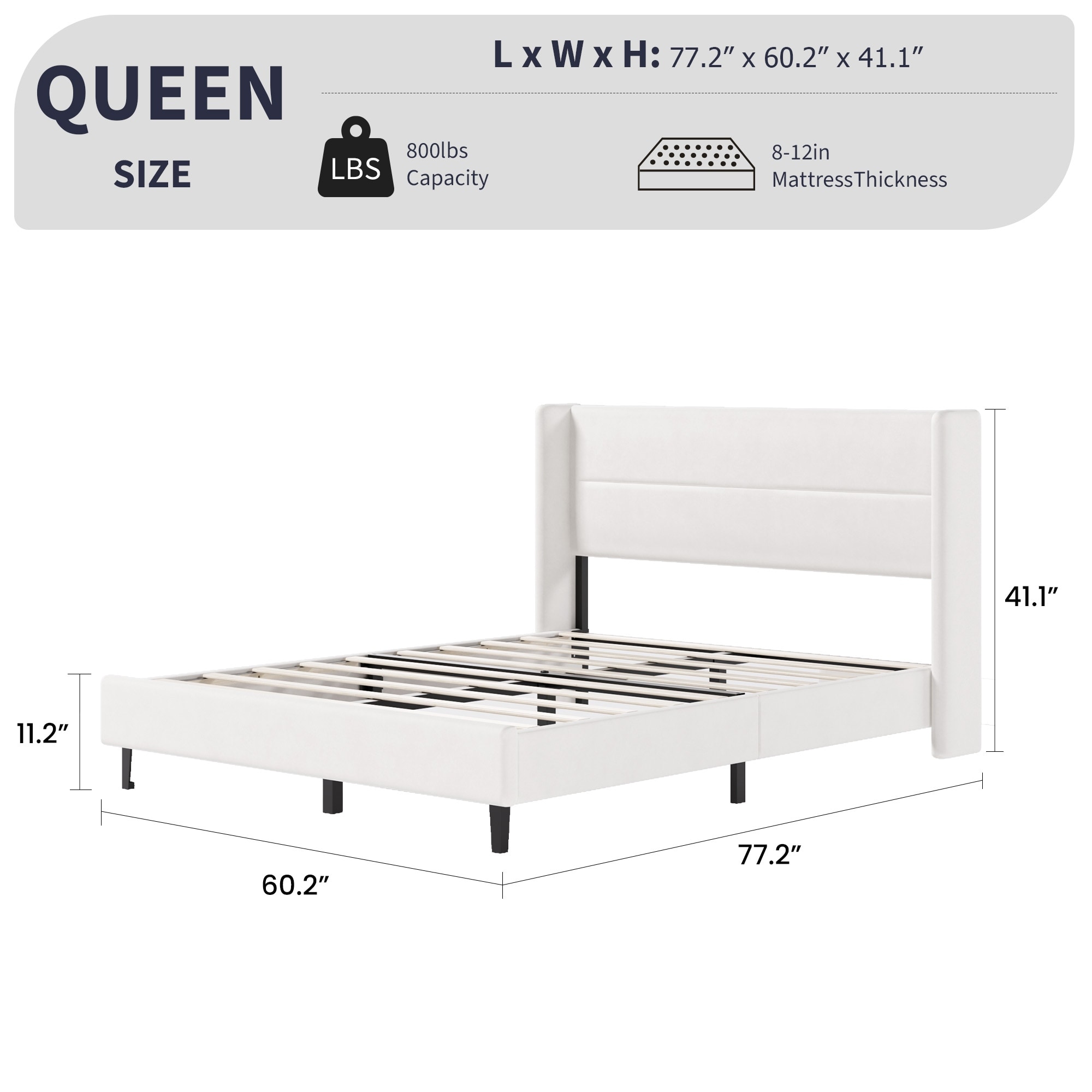 Queen Size Bed Frame with Wingback Headboard, Velvet Upholstered Platform Bedframe with Wood Slats