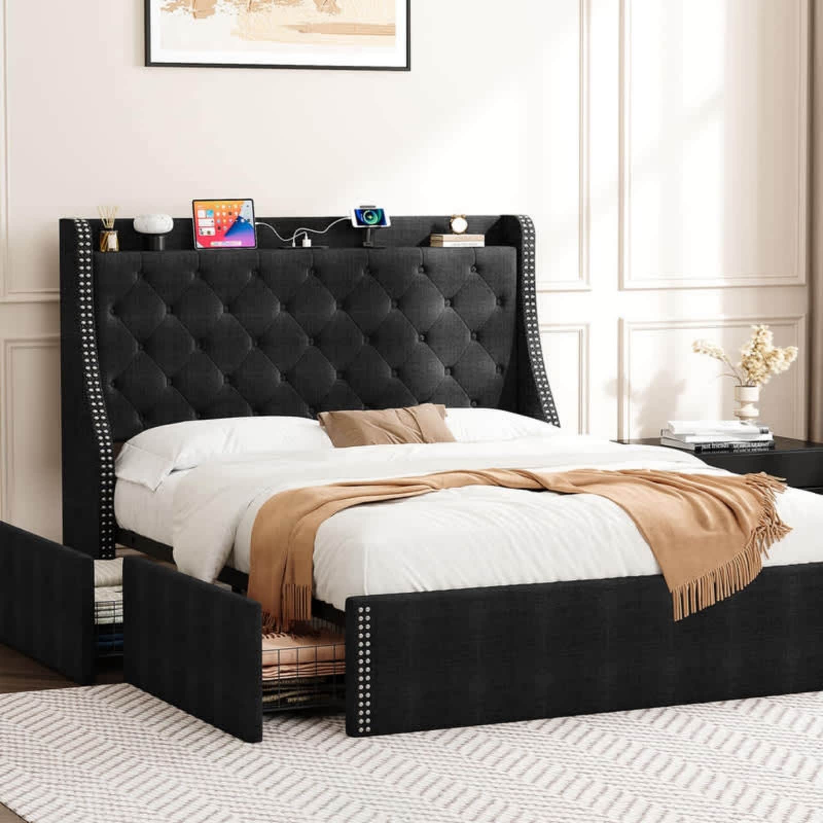 Full Black Upholstered Bed, 4 Drawers, Wingback Headboard, Charging