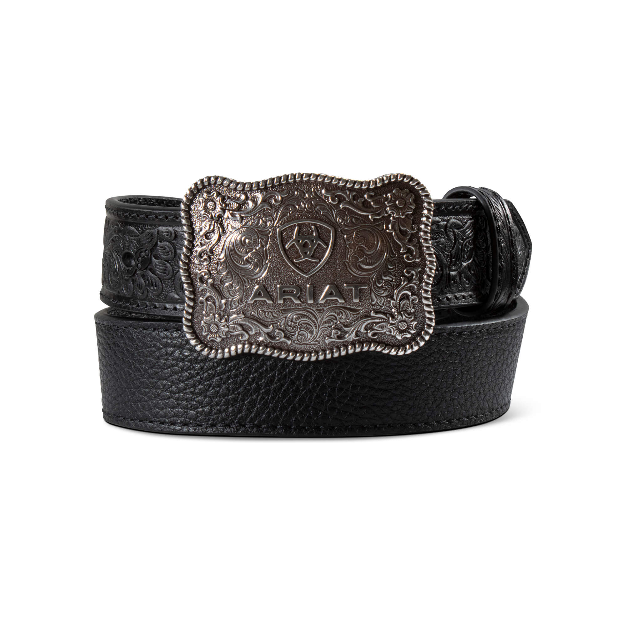 Kid's Floral Tab Belt with Rope Buckle in Black Leather, Size: 20 by Ariat