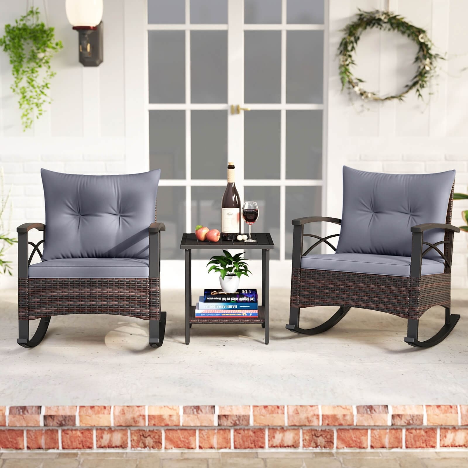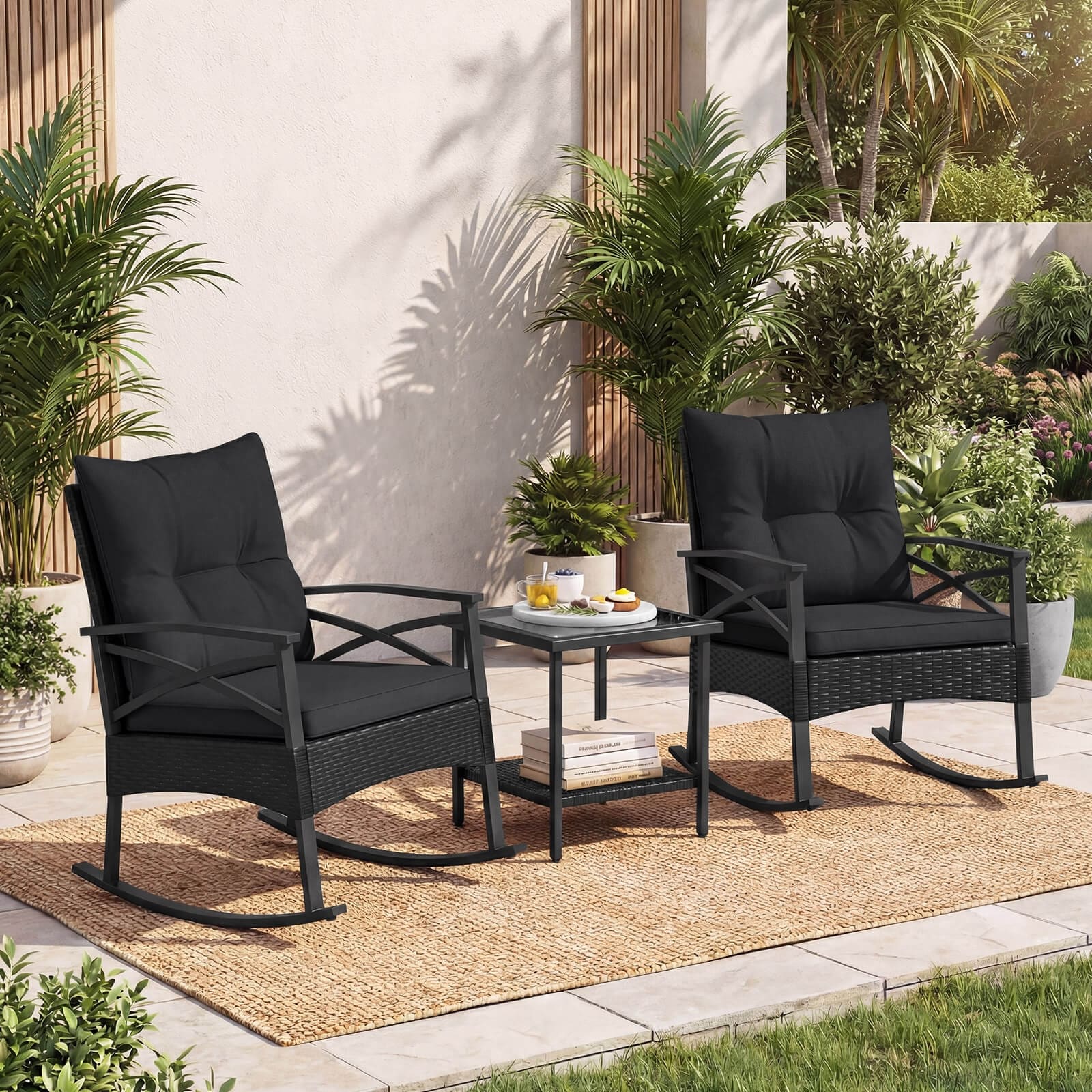 3-Piece Outdoor Patio Black Wicker Metal Rocking Chair Bistro Set with Coffee Table