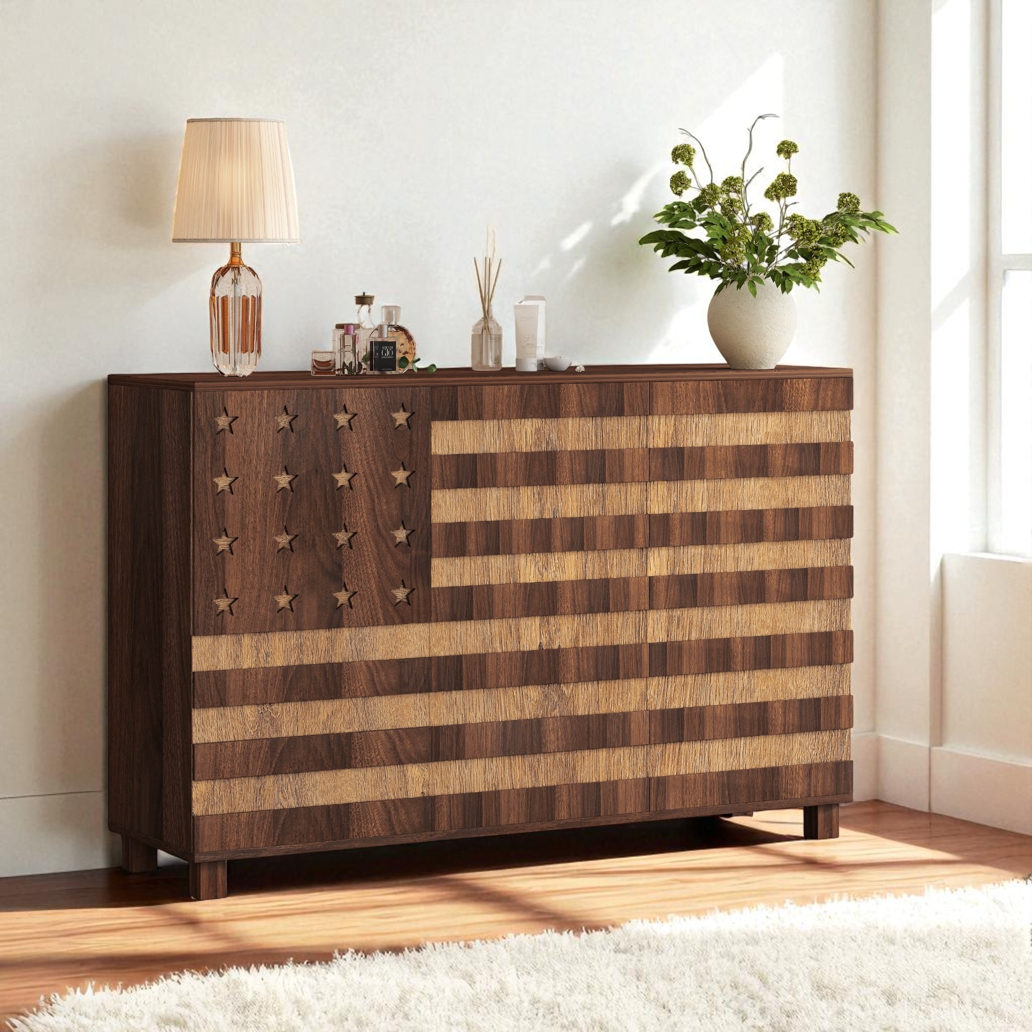 55" Hand-Carved Buffet Sideboard Cabinet with Storage, 2 Drawers and 3 Doors, Coffee Bar Console with Adjustable Shelves