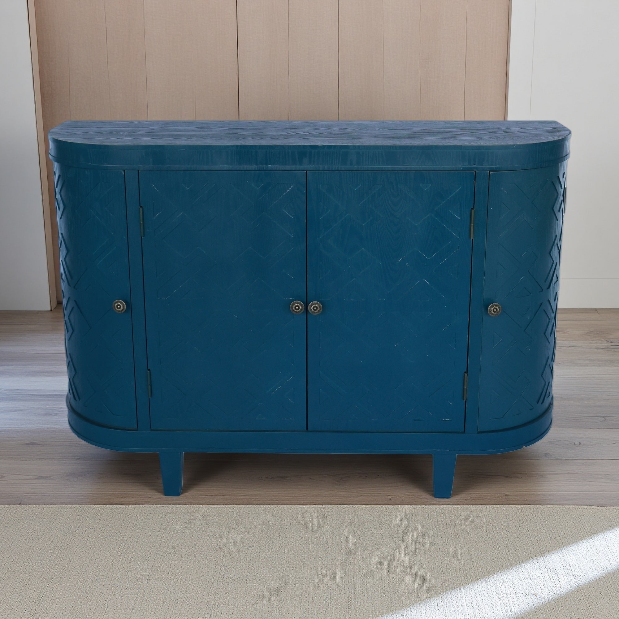 Blue 4-door Curved Corner Design Wavy Door Panel Cabinet with Adjustable Shelves for Study, Living Room and Entrance