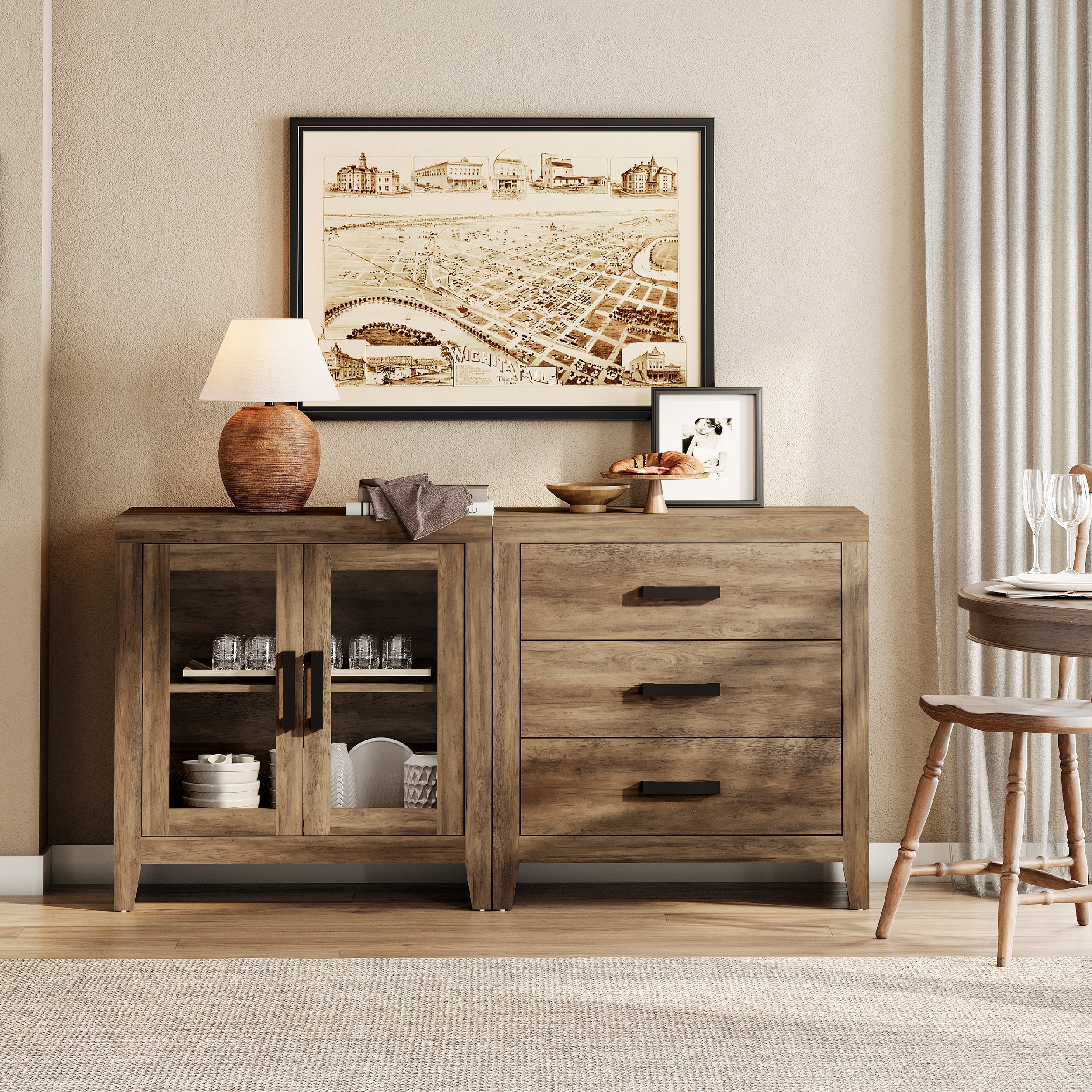 WAMPAT Farmhouse Buffet Cabinet, 2-Piece Sideboard with Glass Door & Storage Drawers for Kitchen