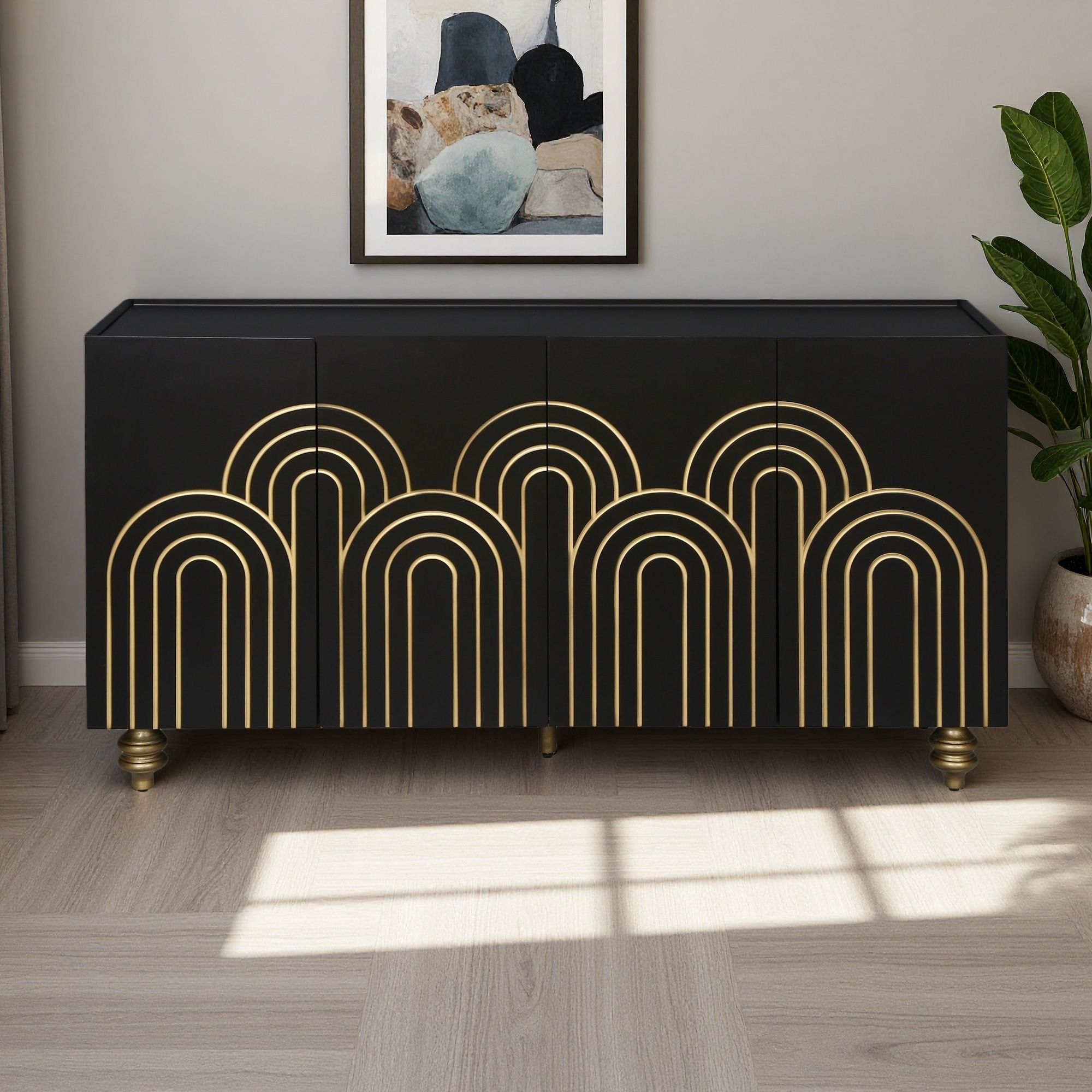 Modern Fluted 4-Door Sideboard with Gold Accents, Adjustable Shelves & Pre-Wired Holes, Sleek Storage for Dining, Living Room
