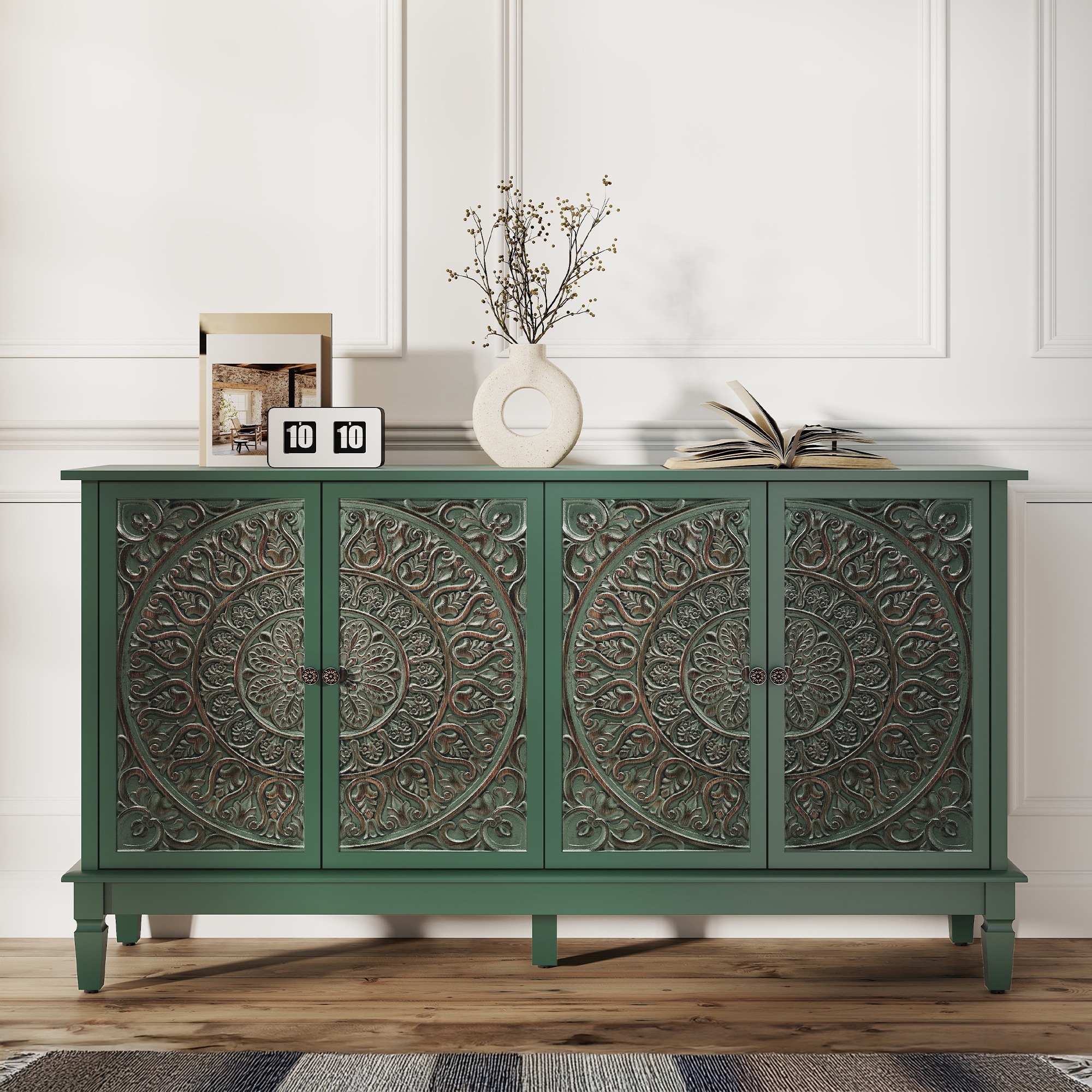 58.3" Kitchen Sideboard Buffet Cabinet, Carved Sideboard with 4-Door and Solid Wood Legs