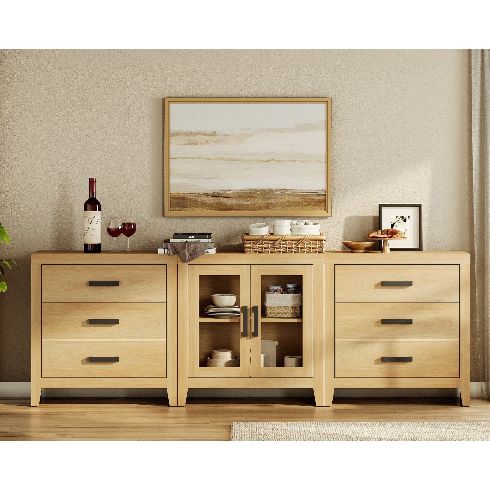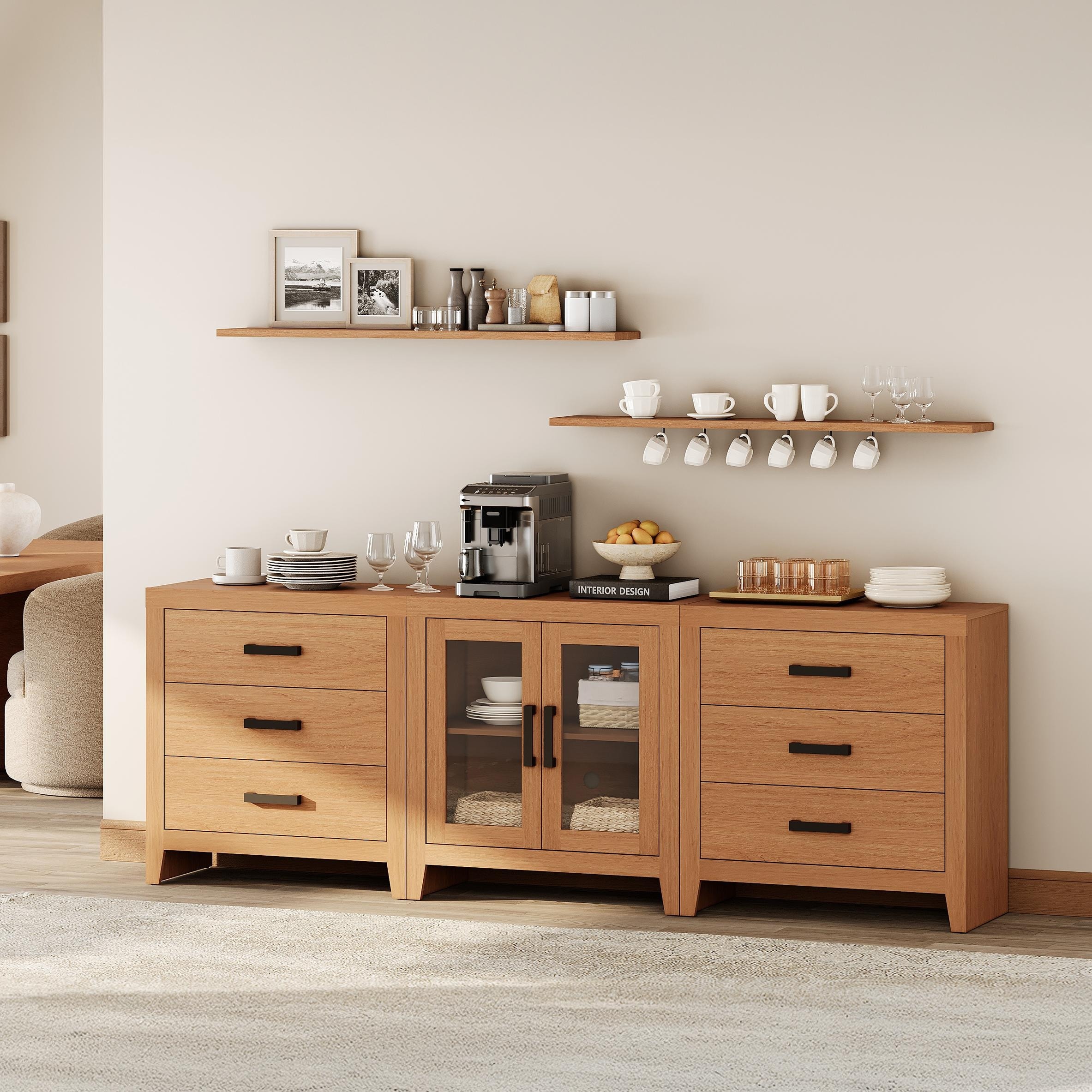 WAMPAT Farmhouse Buffet Cabinet with Glass Doors and Drawers, 3-Piece Modular Sideboard