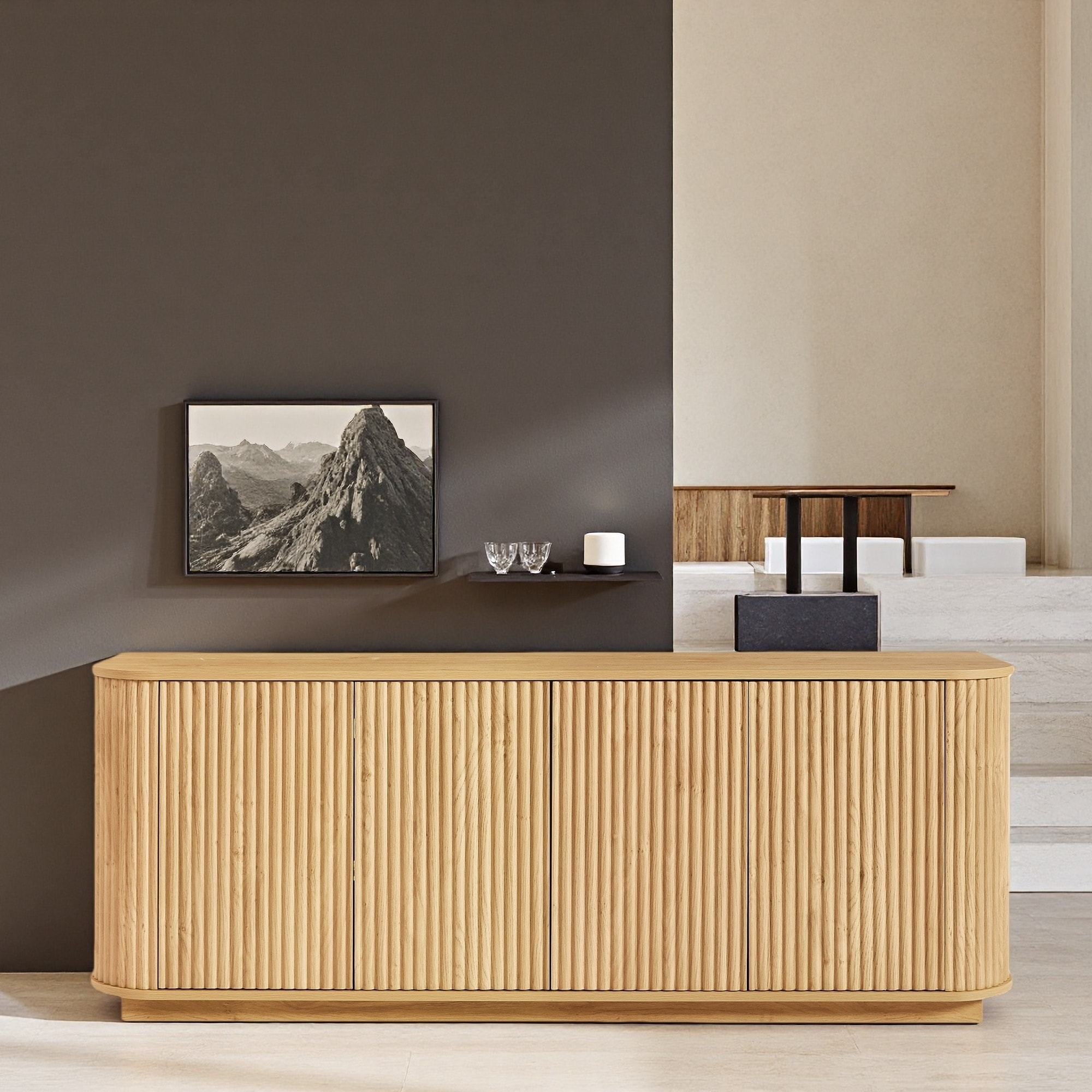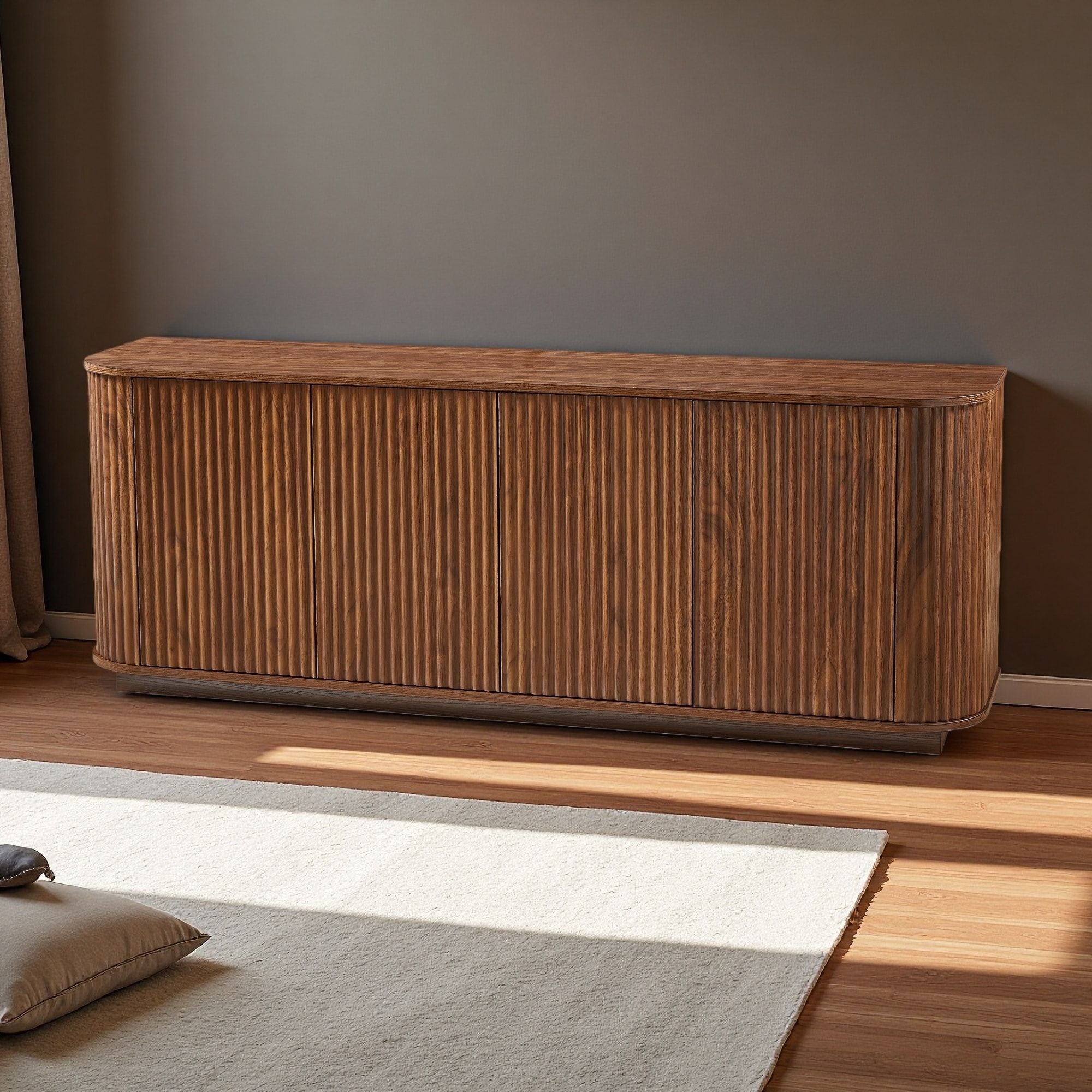Refined Industrial 4-Door Wooden Credenza with Arc Legs, Bronze Clasps & Adjustable Shelves, Versatile Storage for Living Room