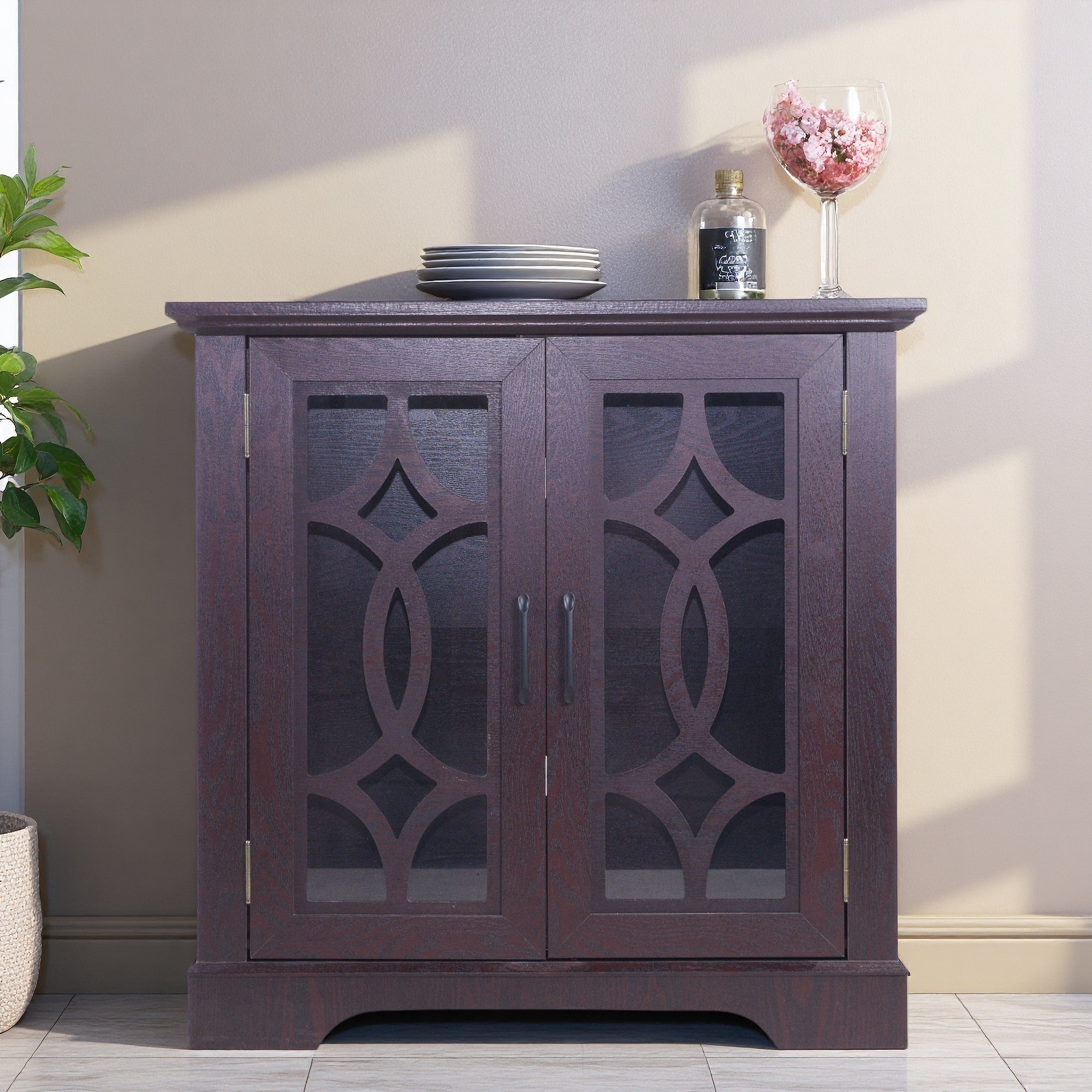 34.37" MDF Tempered Glass 2-Door Sideboard Buffet Cabinet with Adjustable Shelf and Display Storage for Dining Room