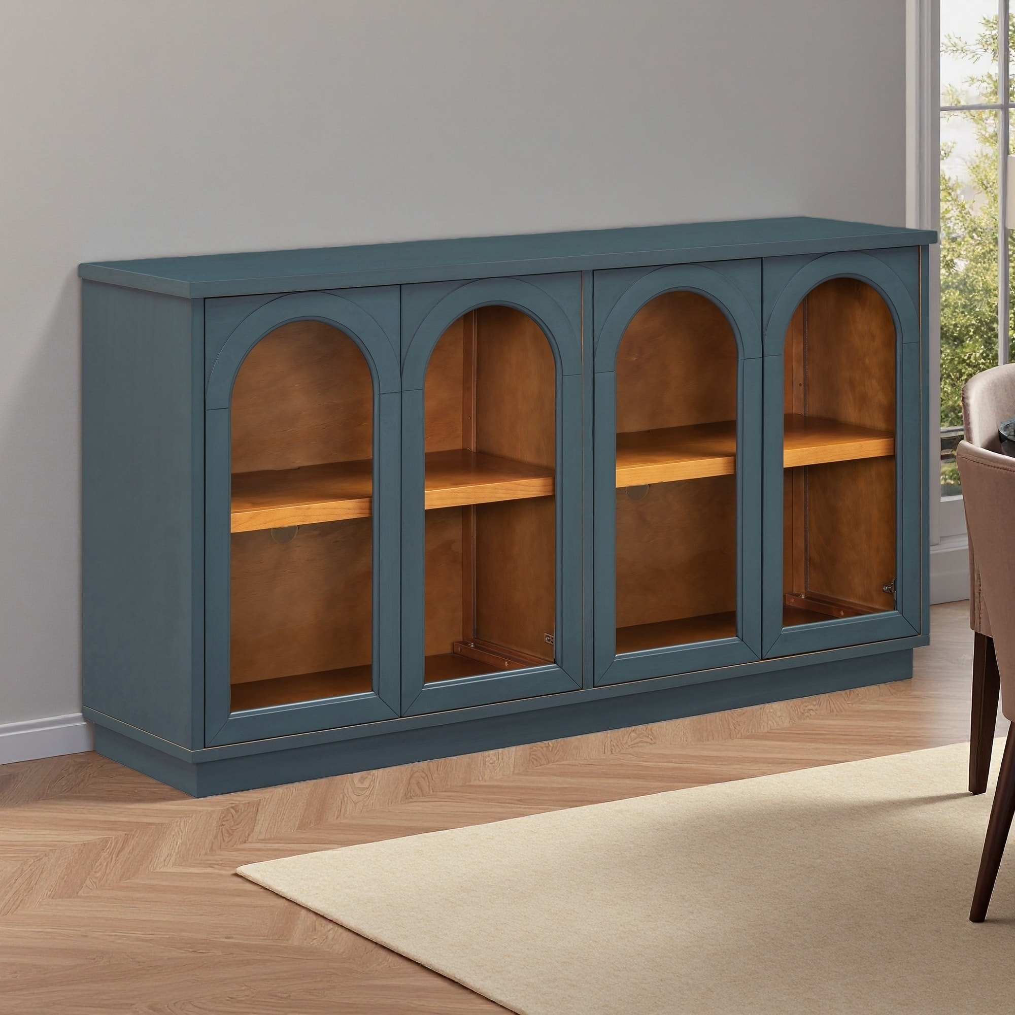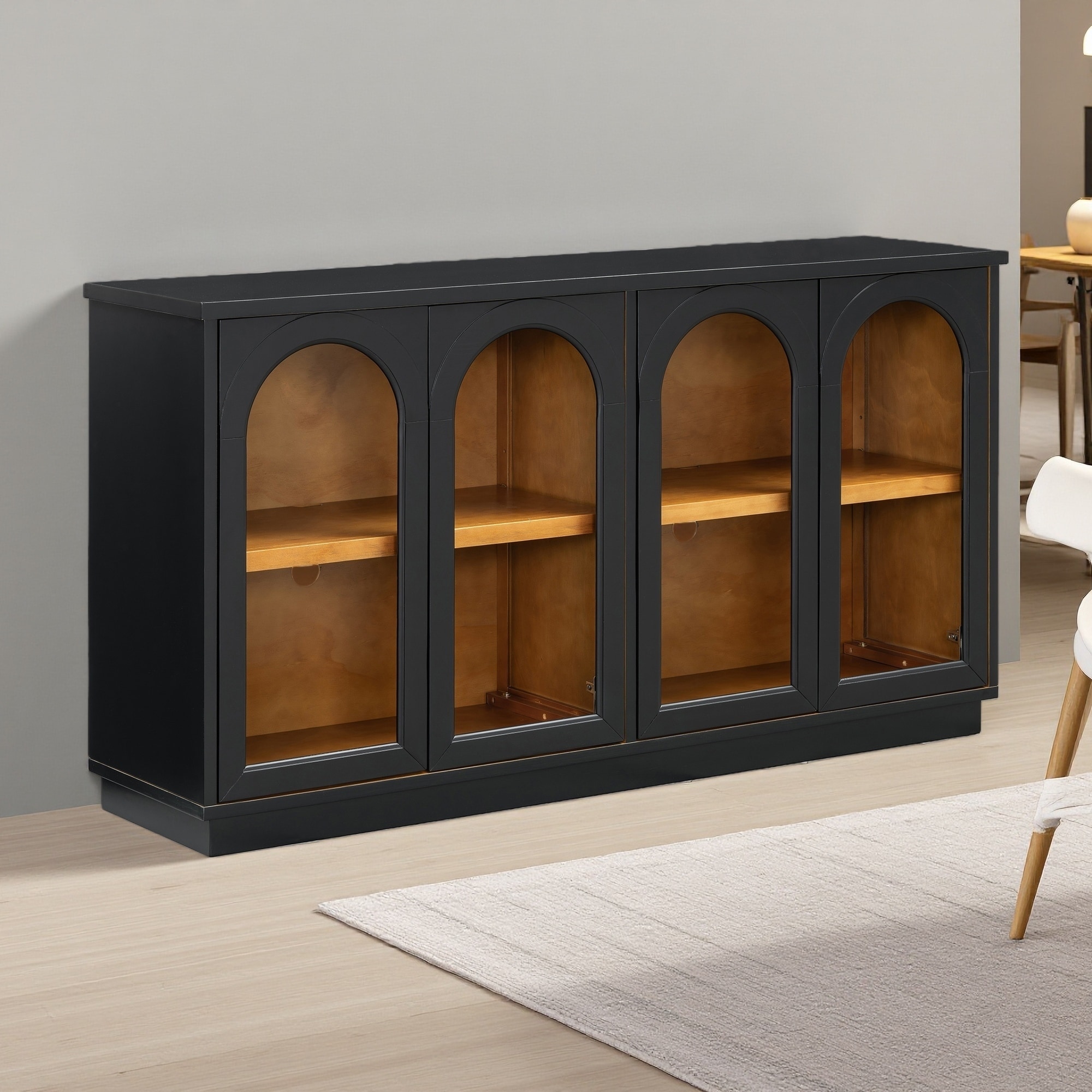 4-Door Arched Glass Buffet Cabinet with Adjustable Shelves, MDF & Pine Wood Sideboard for Kitchen, Dining Room