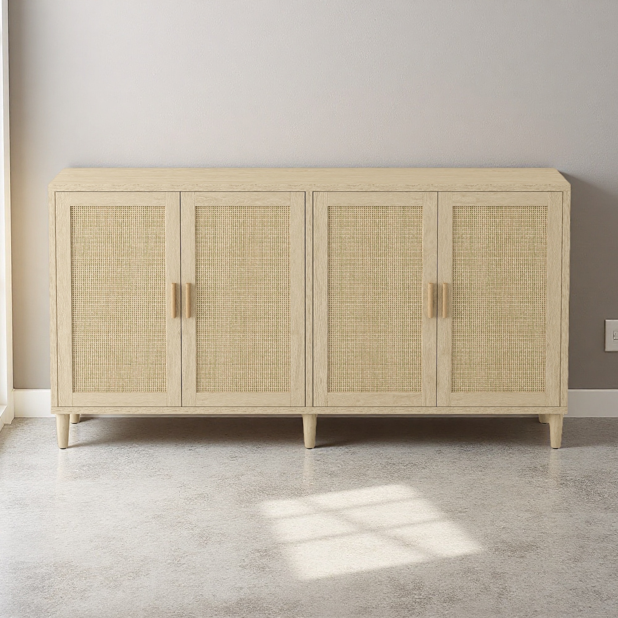 70" Rattan Buffet Cabinet with 4 Doors and Adjustable Shelves, Solid Wood Legs, for Living Room, Kitchen, Dining Room