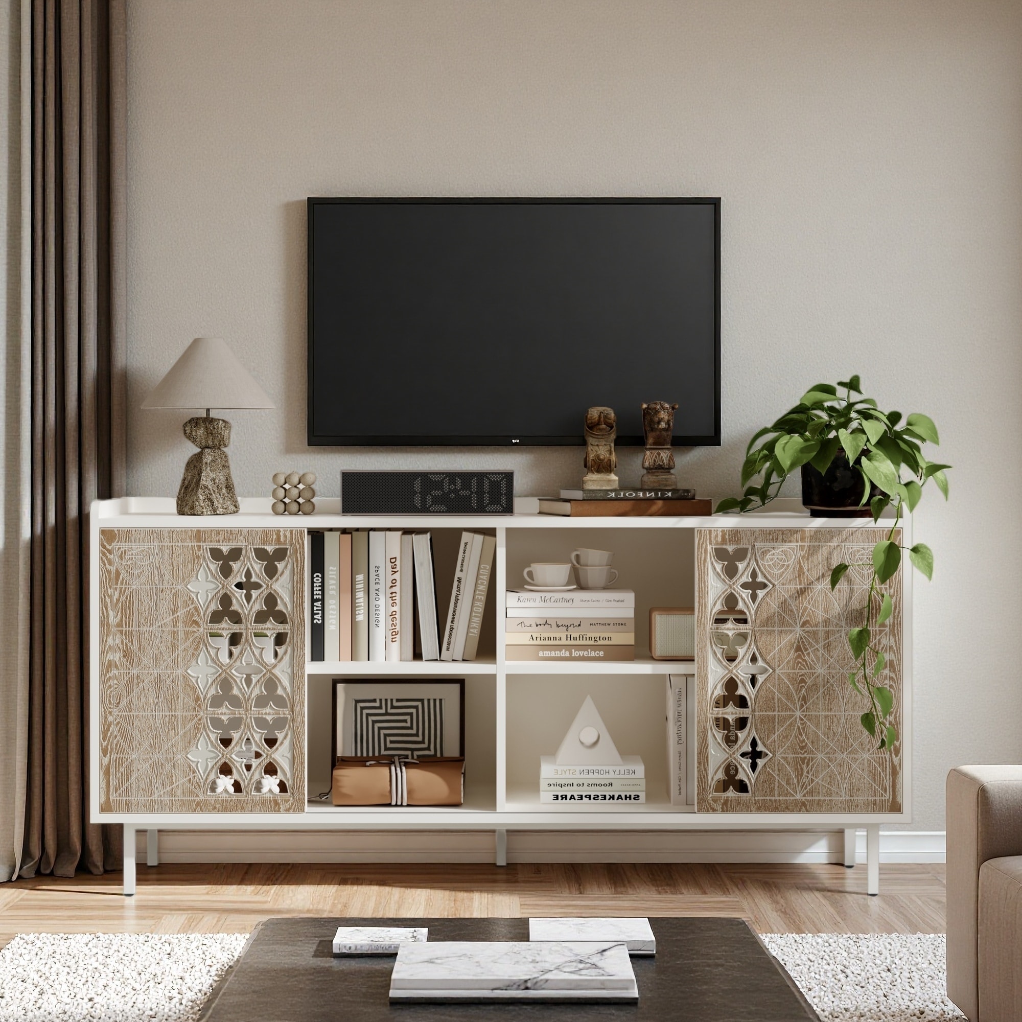 Sideboard Buffet, Mid Century Modern Storage Cabinet with Doors & Shelves, Boho Style Wooden Buffet Cabinet for Living Room
