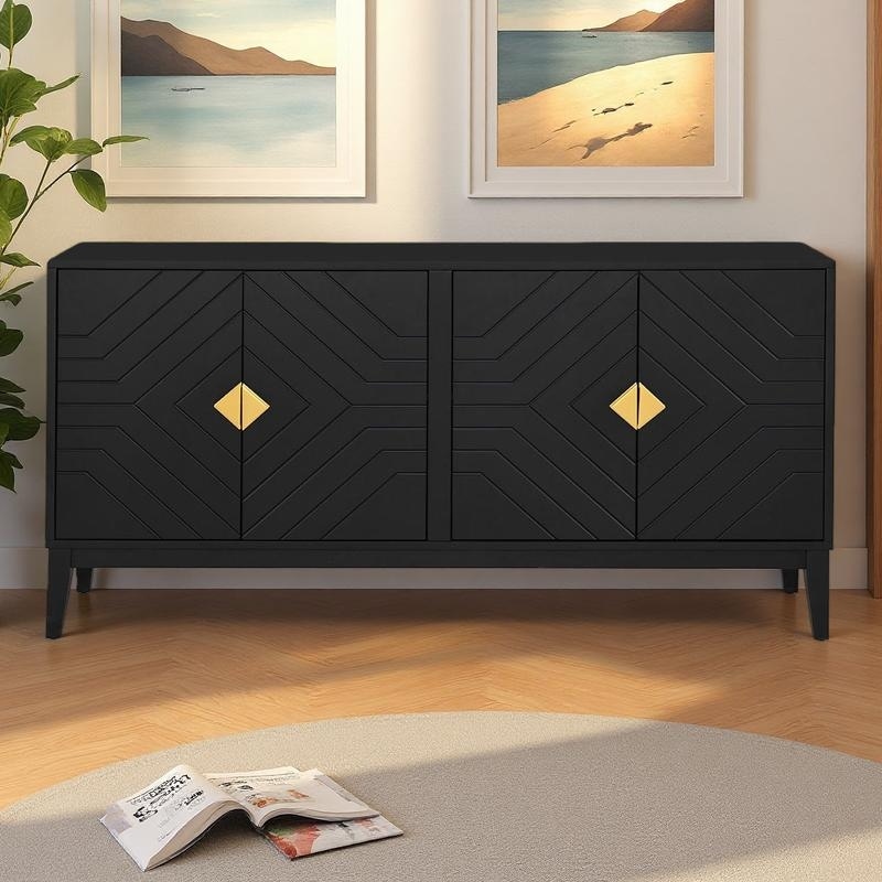 59.84" MDF and Solid Wood Sideboard Cabinet with 4 Wavy Pattern Doors, Adjustable Shelves, Rebound Press-to-Open for Living Room