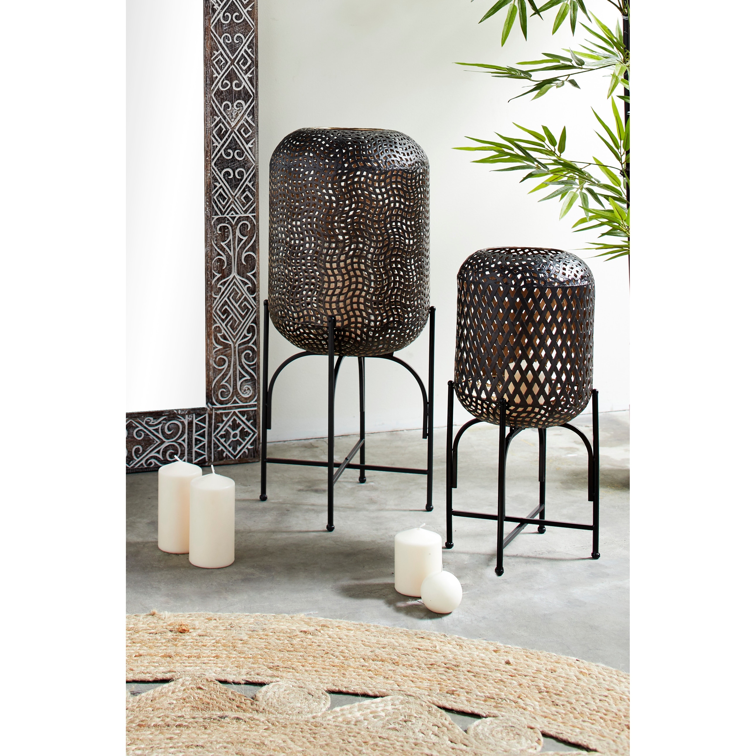 Modern Style Large Round Bronze Metal Floor Lantern with Pierced Metal Pattern - Brown