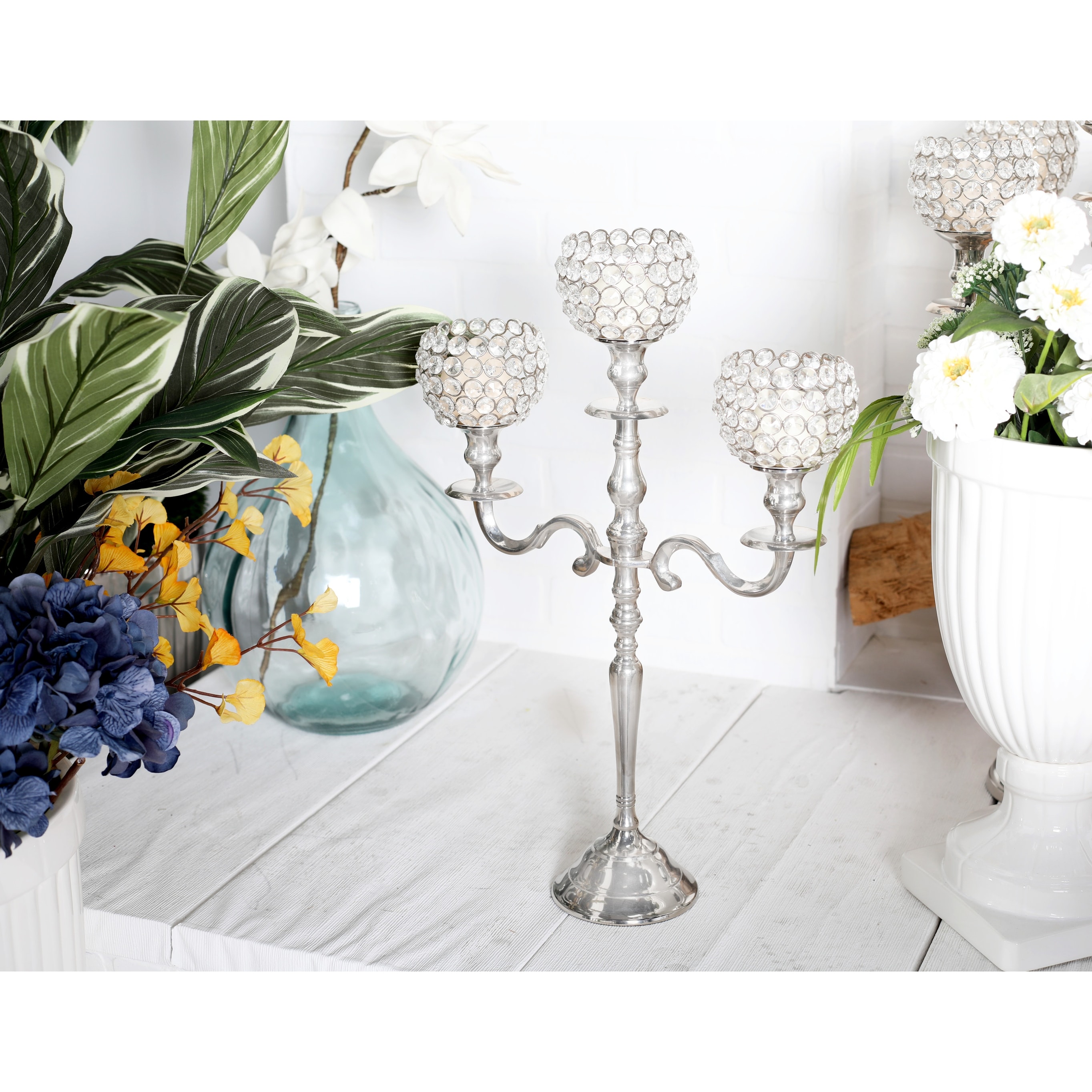 Large, Round Modern Silver Hurricane Glass Candle Holder 8" x 12"