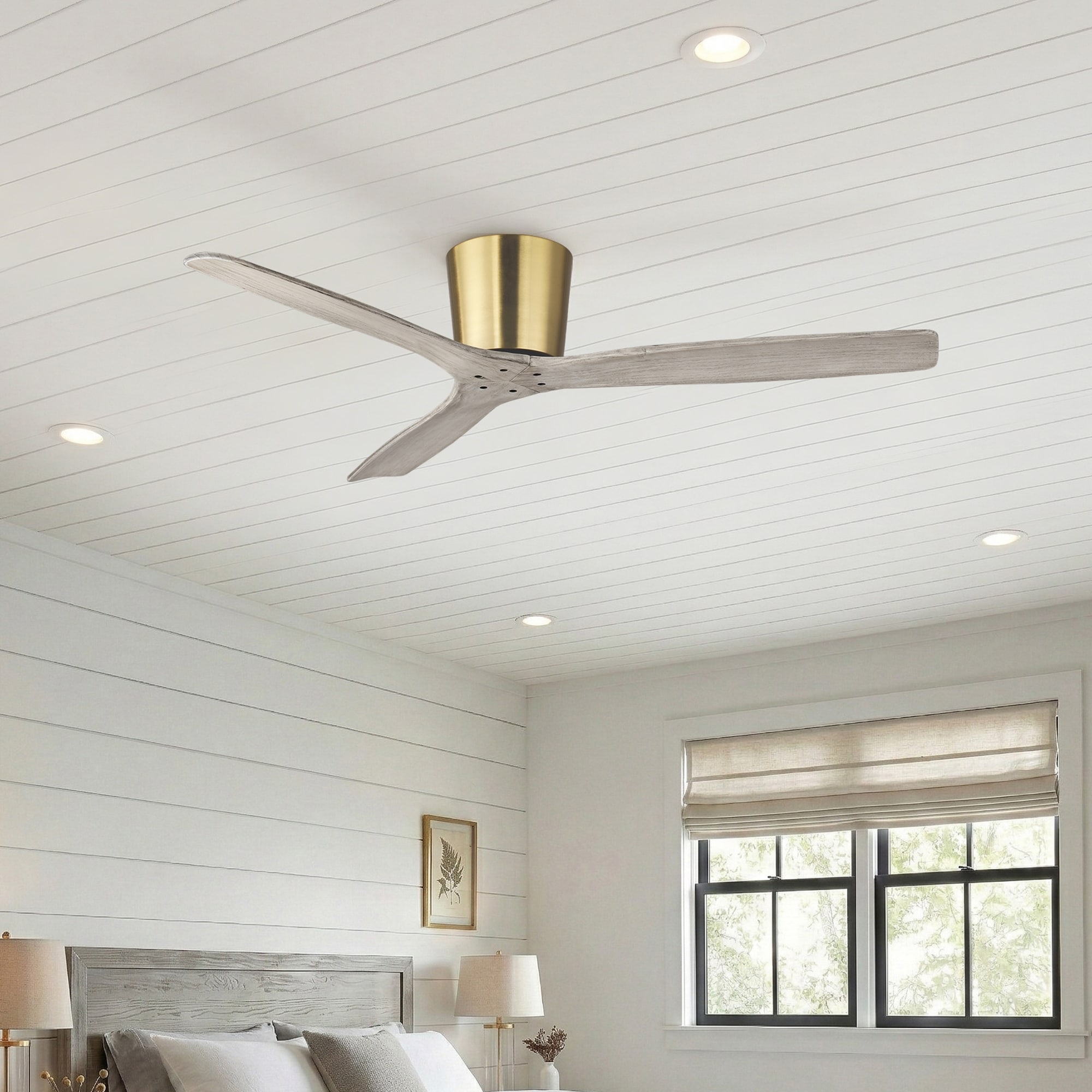 54" Modern Minimalist Weathered Solid Wood Gold Flush Mount Ceiling Fan with Remote and 6-Speed DC Motor