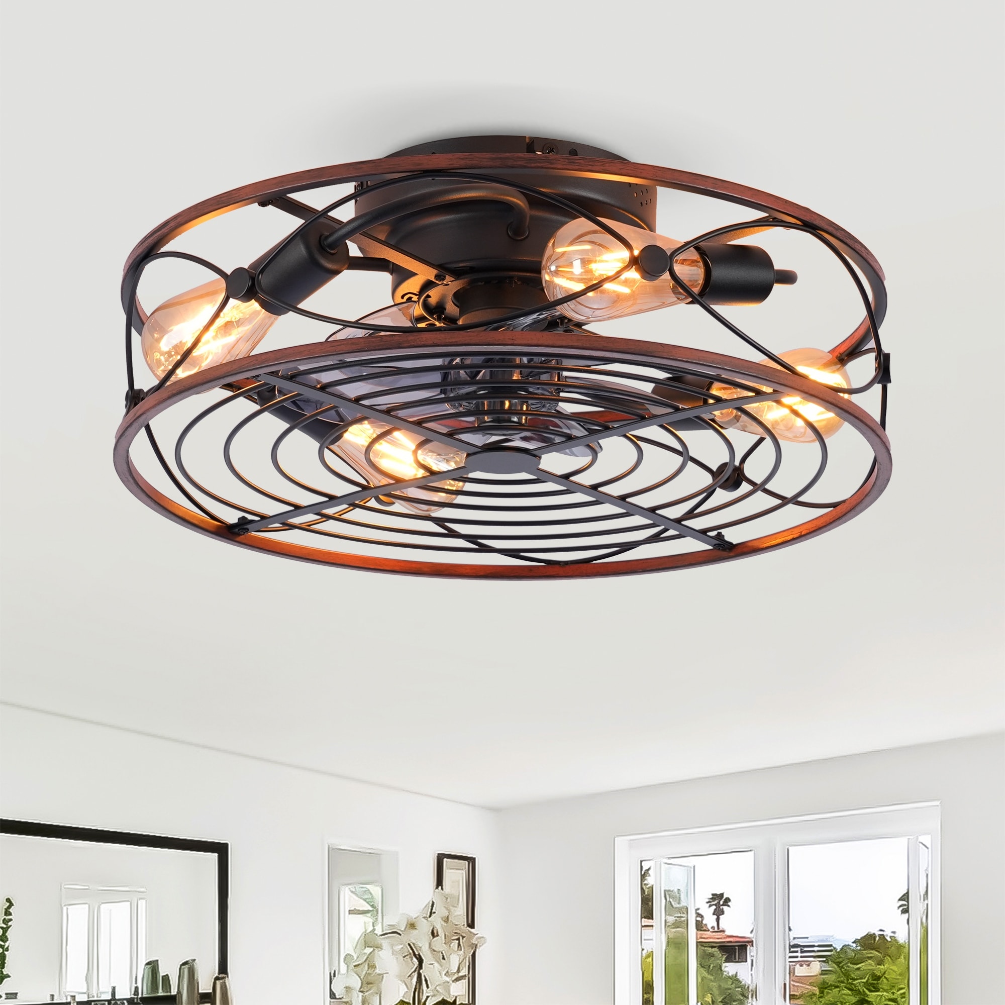 20'' Farmhouse Caged Ceiling Fan with Lights and Remote Control , Black Bladeless Reversible DC Motor Ceiling Fan