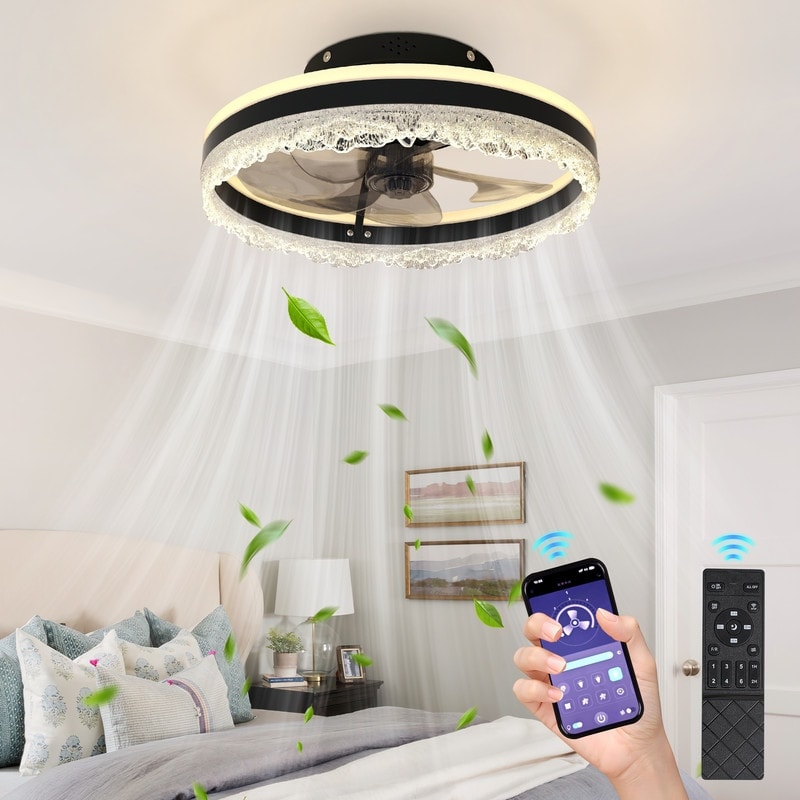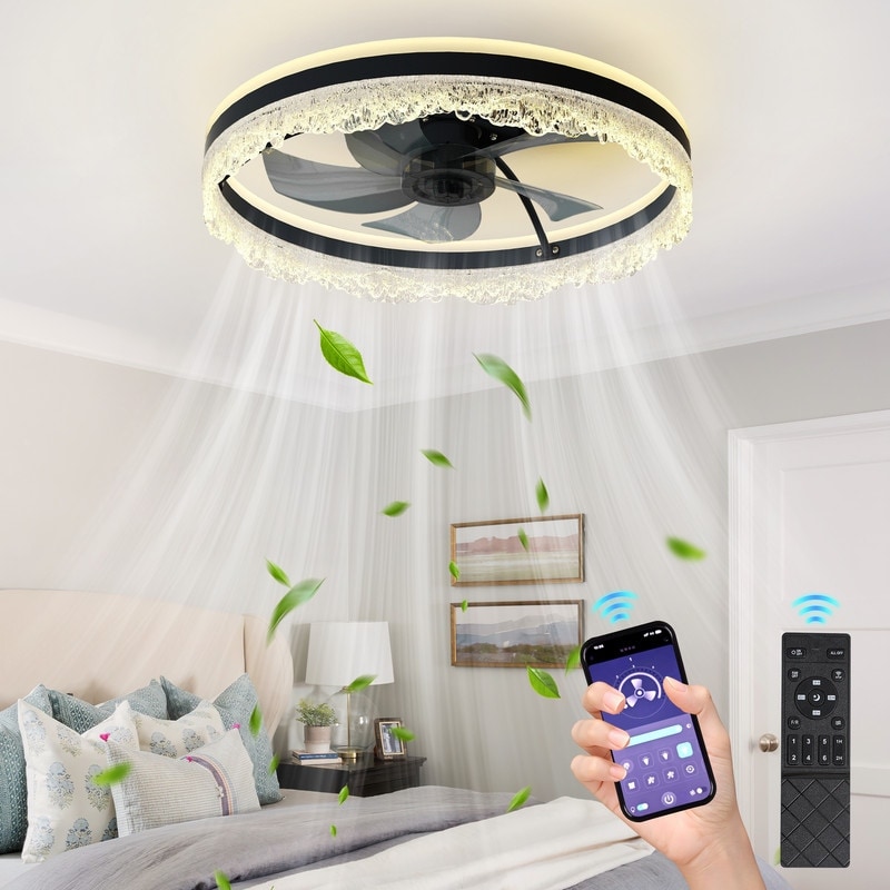 Smart Silent LED Ceiling Fan with Light Crystal Flush Mount, Hidden Blades