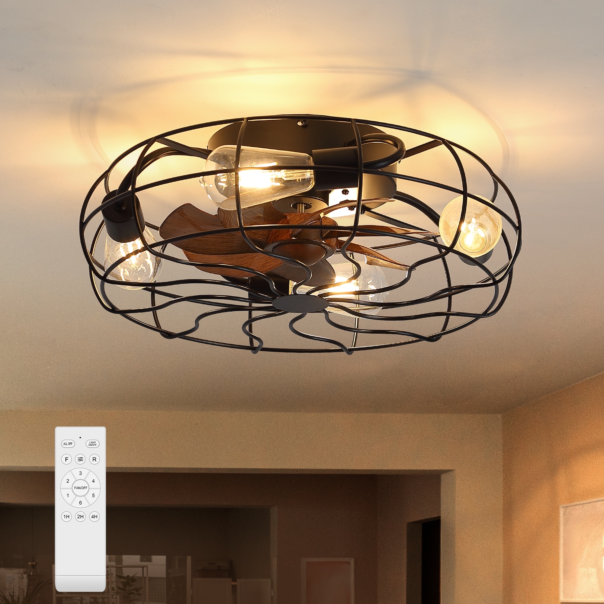 Sofucor 20 inch Flush Mount Ceiling Fan Light with Remote Caged Farmhouse Fandelier Black Wood Low Profile