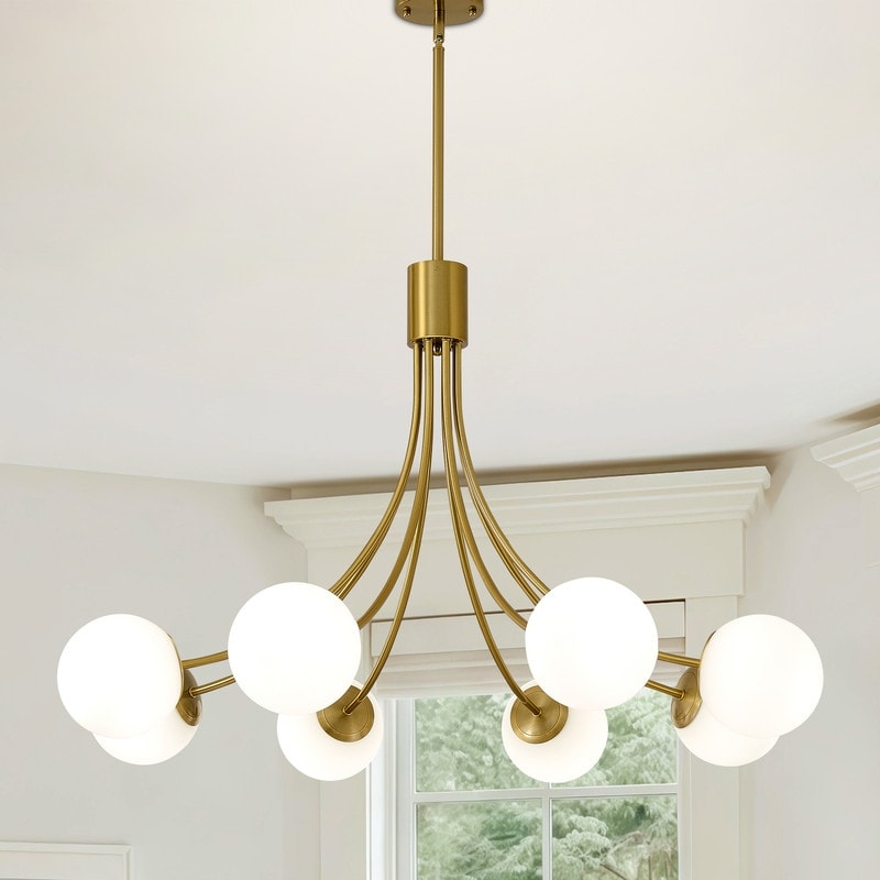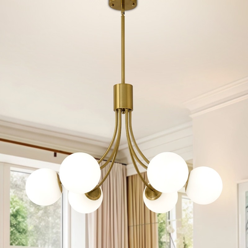 Modern Mid Century Gold Chandelier Sputnik Light Fixture for Living Room Dining Room with White Globe Glass Shade