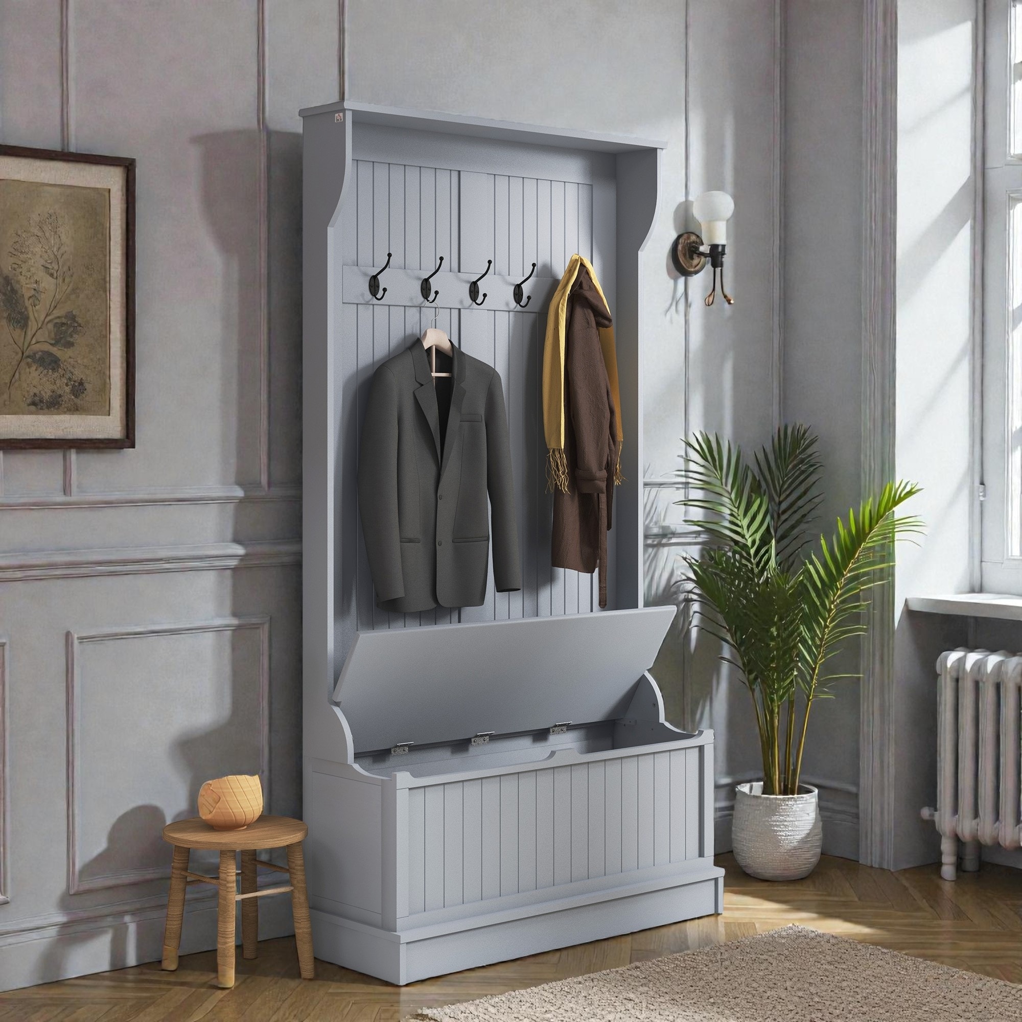 38" 3-In-1 Entryway Hall Tree with Storage Bench, Coat Rack with Four Hooks and Shoe Storage, Gray