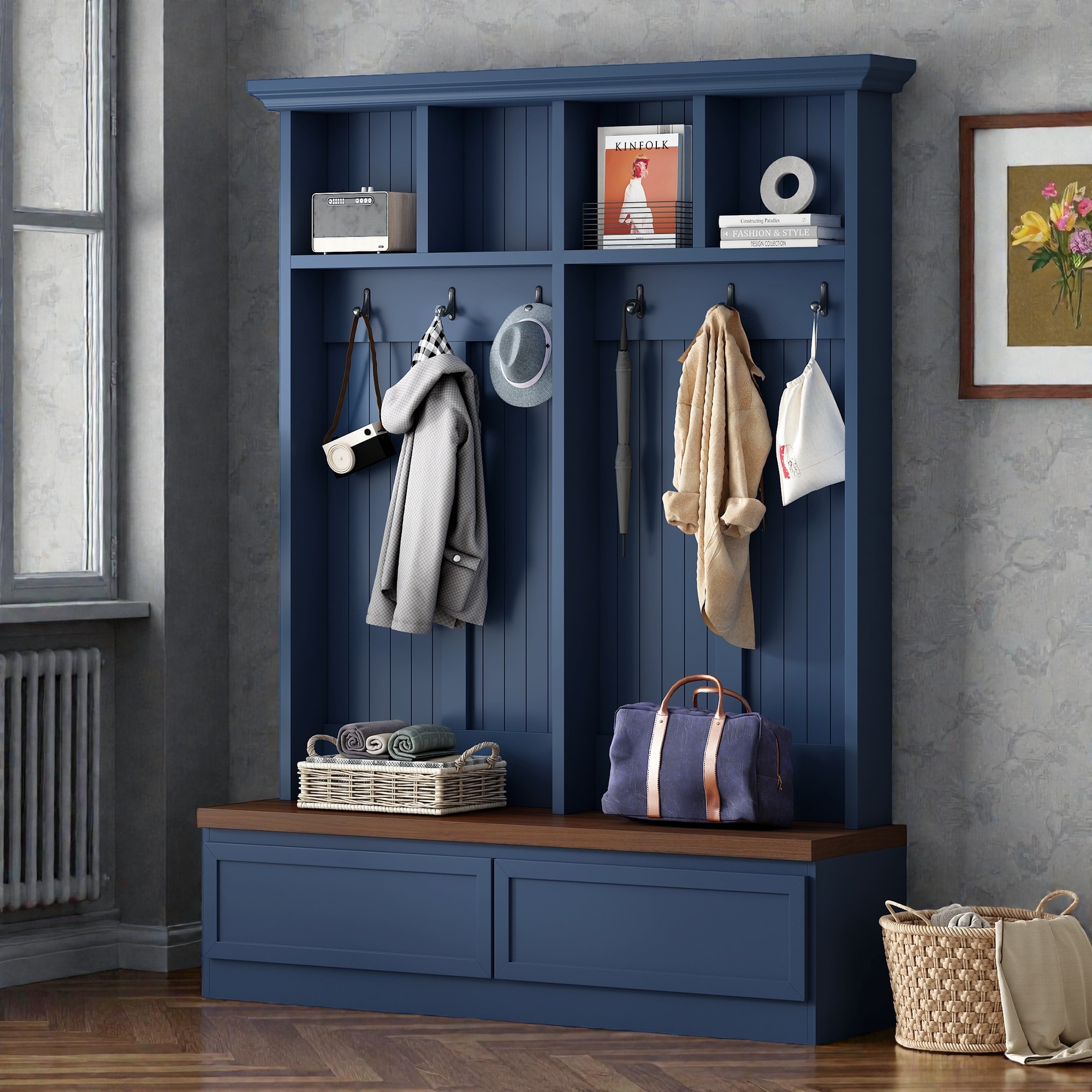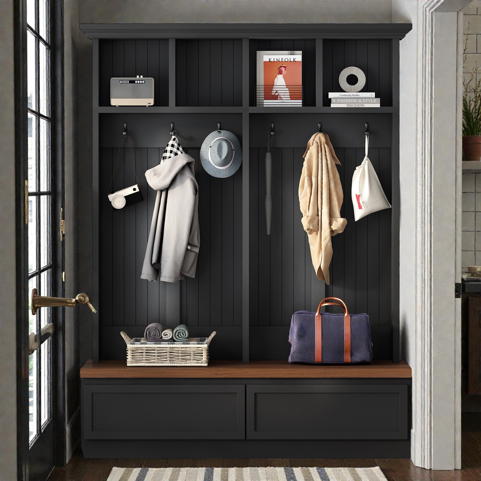 Hall Tree with Bench, 2 Storage Drawers, 6 Hooks and Upper Cubbies, Entryway Organizer with Seating and Storage