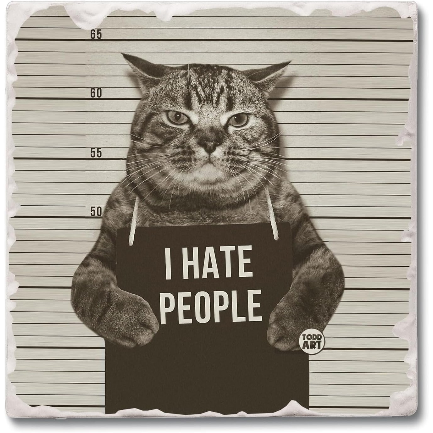 Thirstystone Hate People Cat 4 Pack Tumbled Tile Coaster Manufactured in The USA