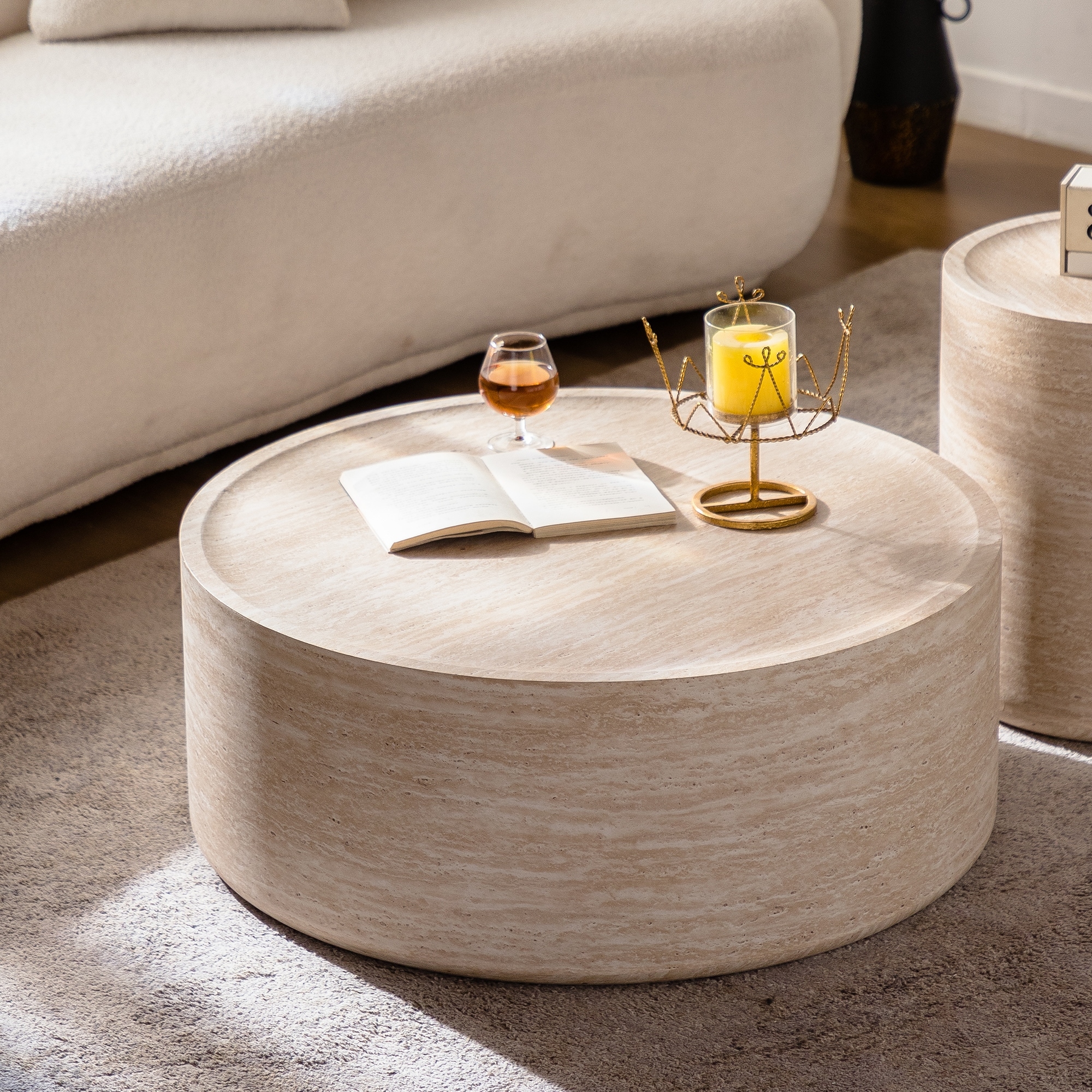 GDFStudio - Aurelia Modern Round Drum Coffee Table with Mars Pattern Wooden Top - No Assembly Required