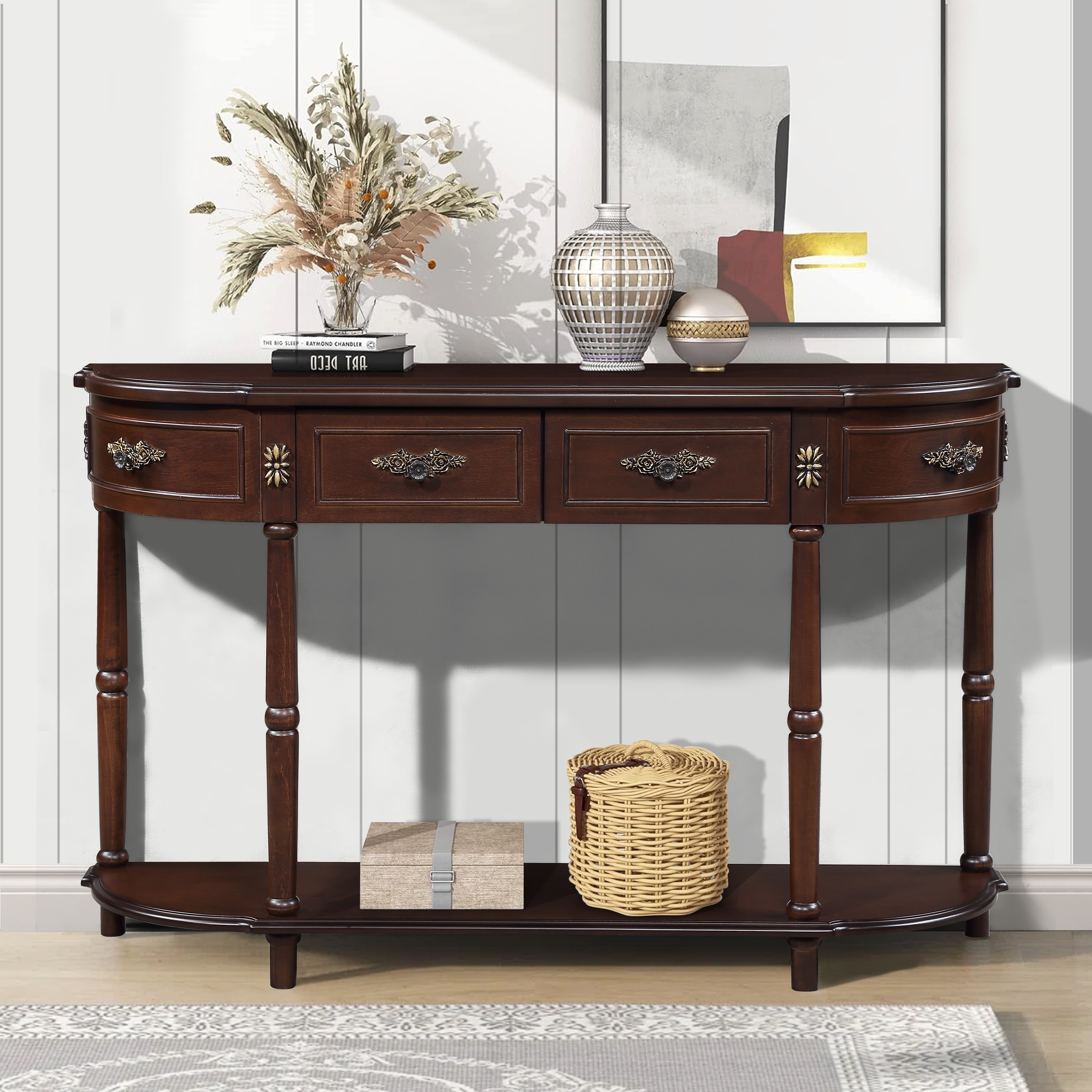 Retro Curved Wood Console Table with Open Shelf, Entryway Table Sofa Table Hallway Table with Drawers