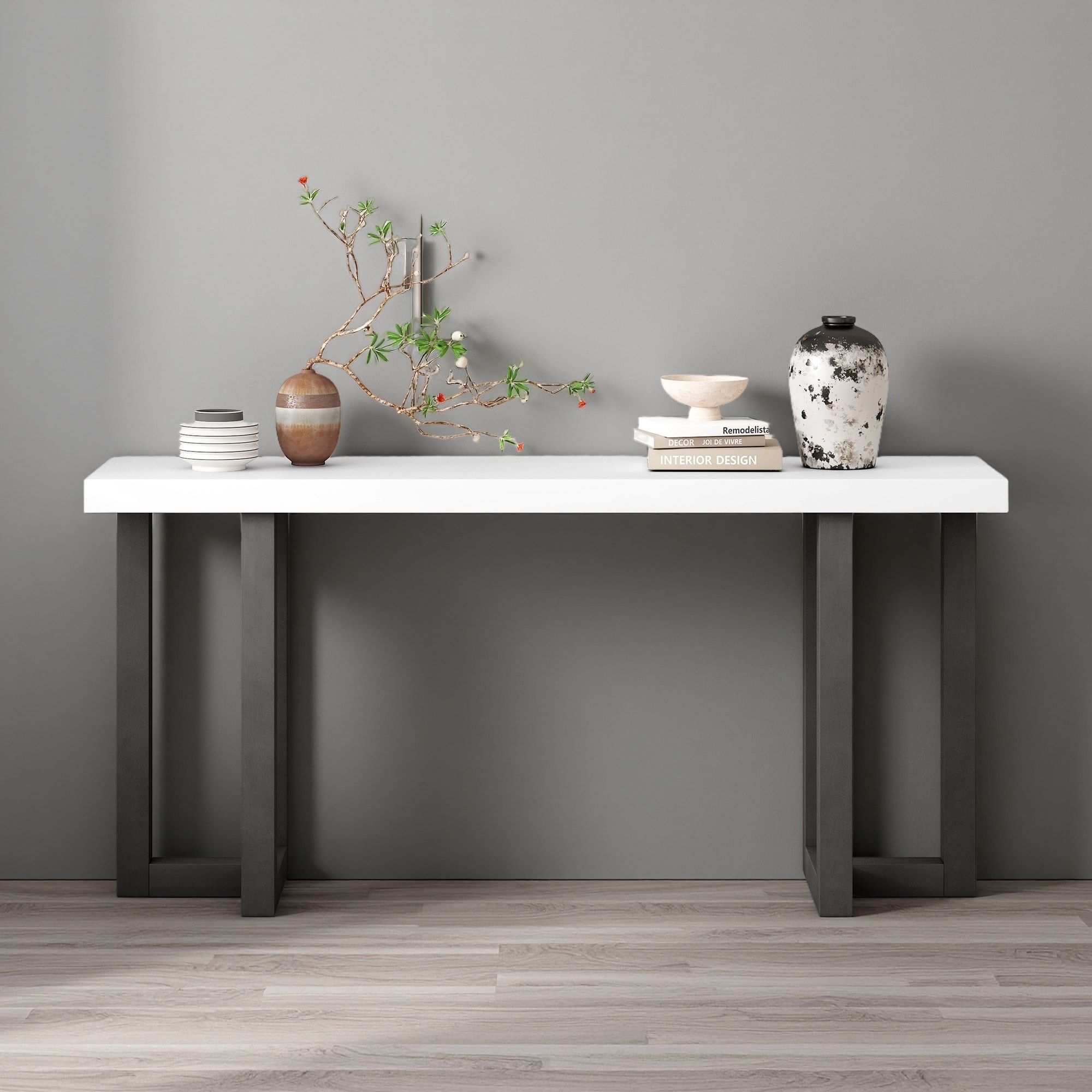63" Pine Veneer Console Table with Geometric Legs & MDF Top