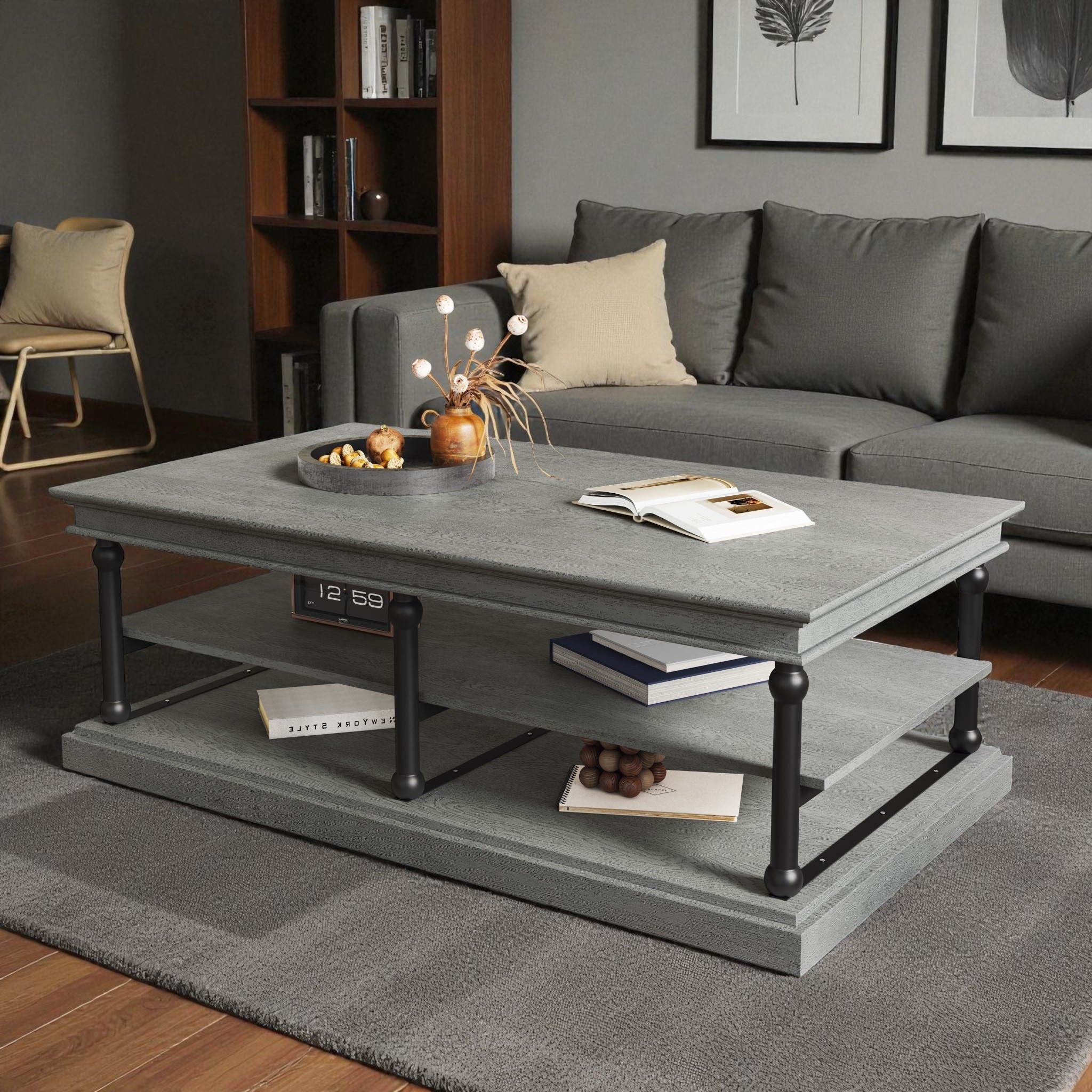 Farmhouse Lift Top Coffee Table with Fixed Shelf - 3 Hidden Storage Trays, Weathered Finish, Versatile Two-Tier Table