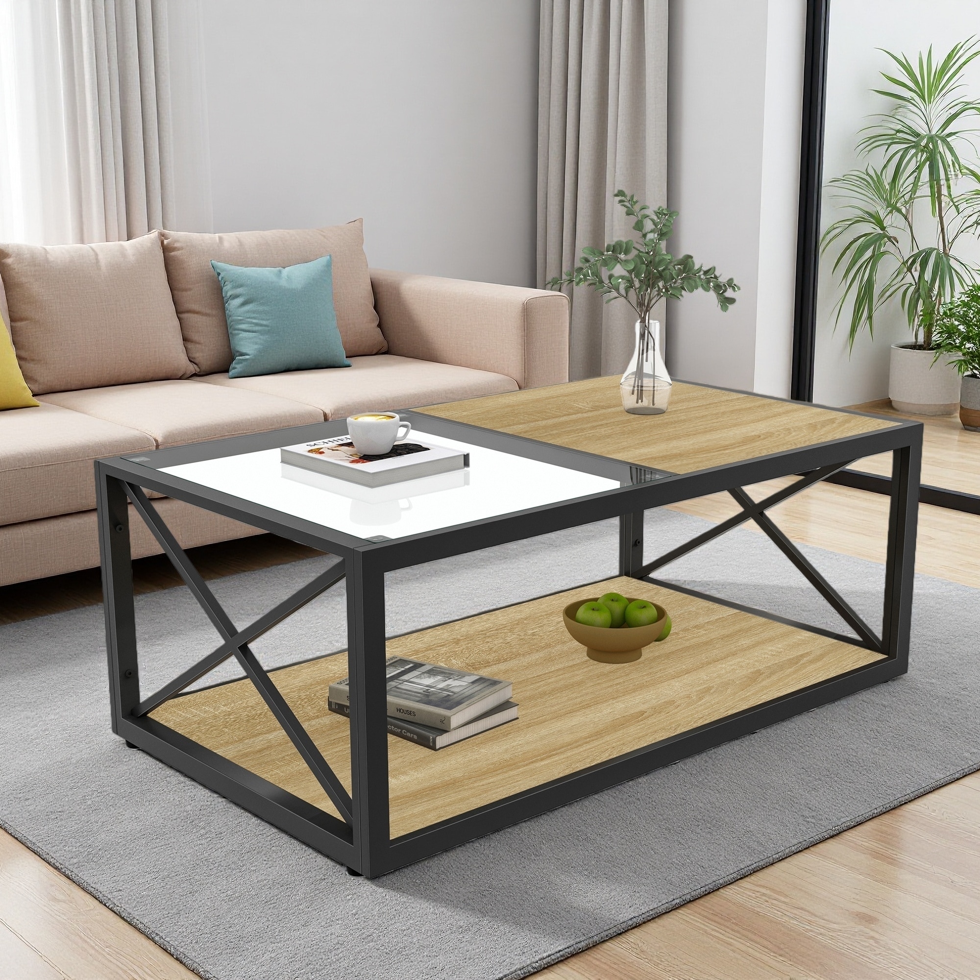 39.37" Tempered Glass and Rustic Wood Grain MDF Coffee Table with Metal Frame