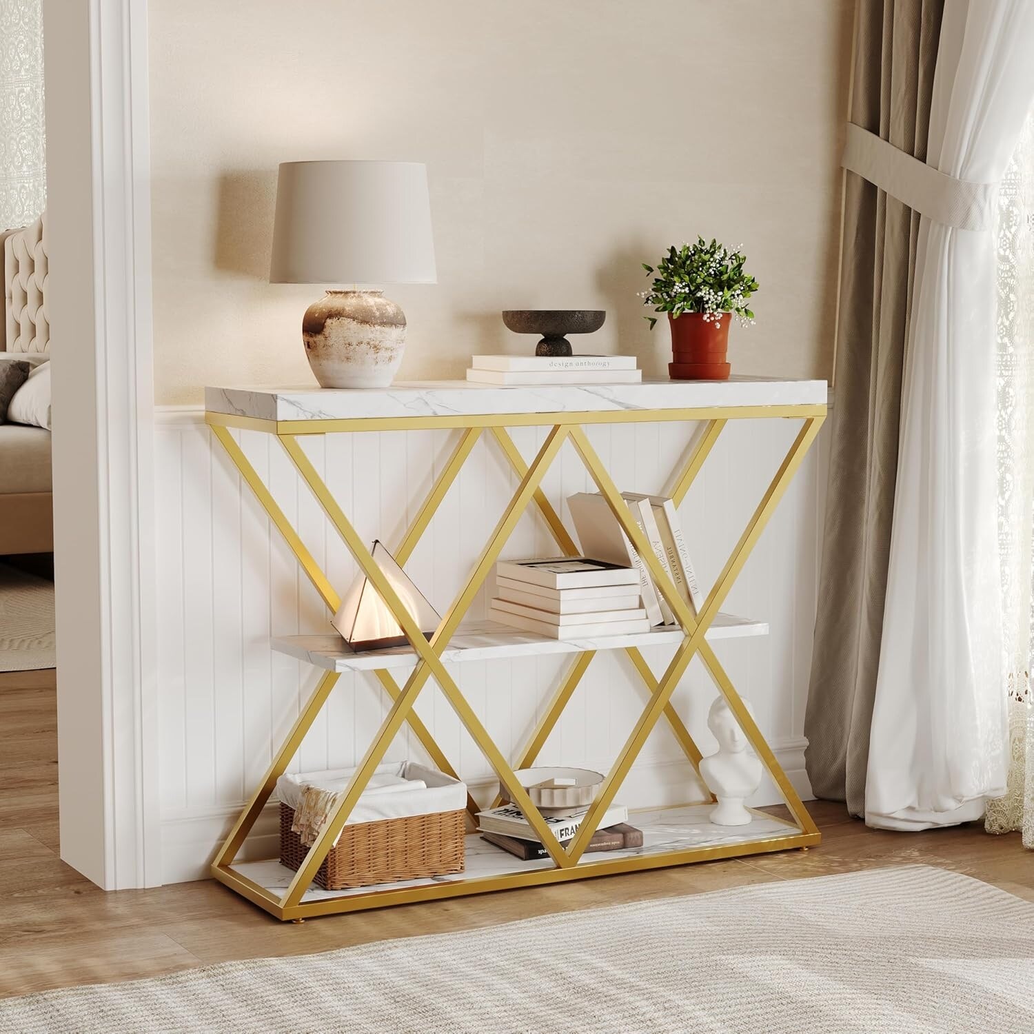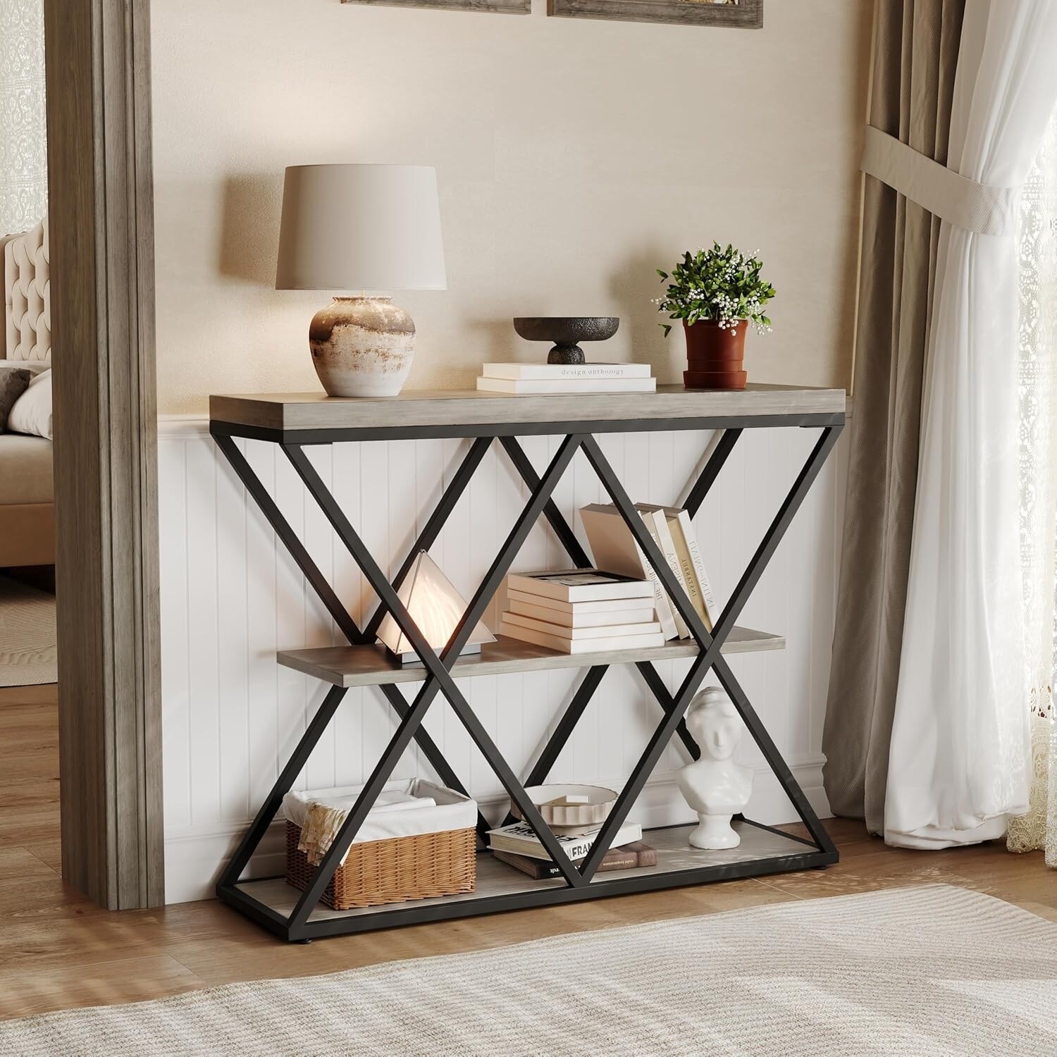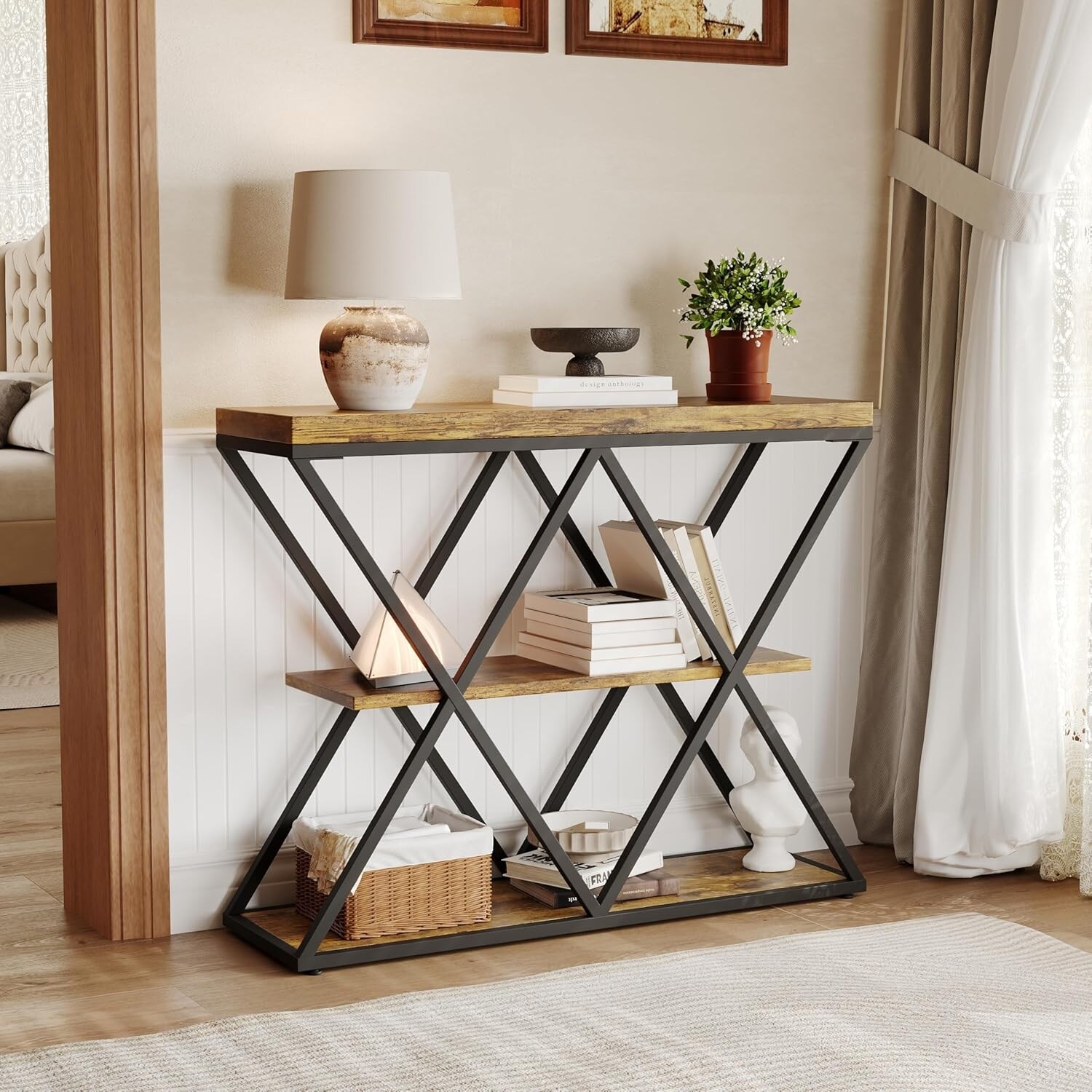 32.8in 3-layer Industrial Style Console Table, X-shaped Metal Frame, Sofa Side Table, Open Storage Shelf