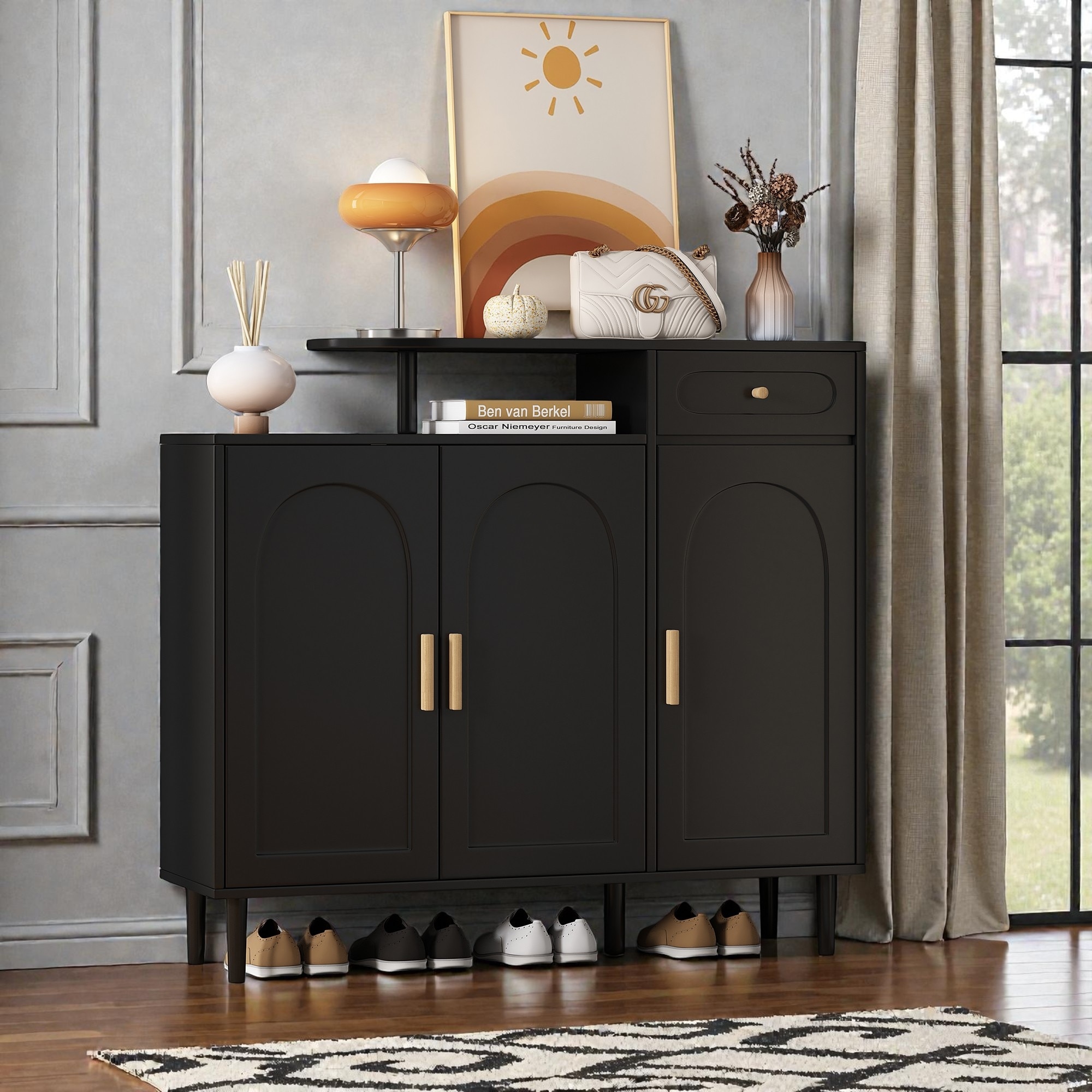 Shoe Storage Cabinet with Arched Doors and Drawer, Entryway Sideboard with Adjustable Shelves and Double Top