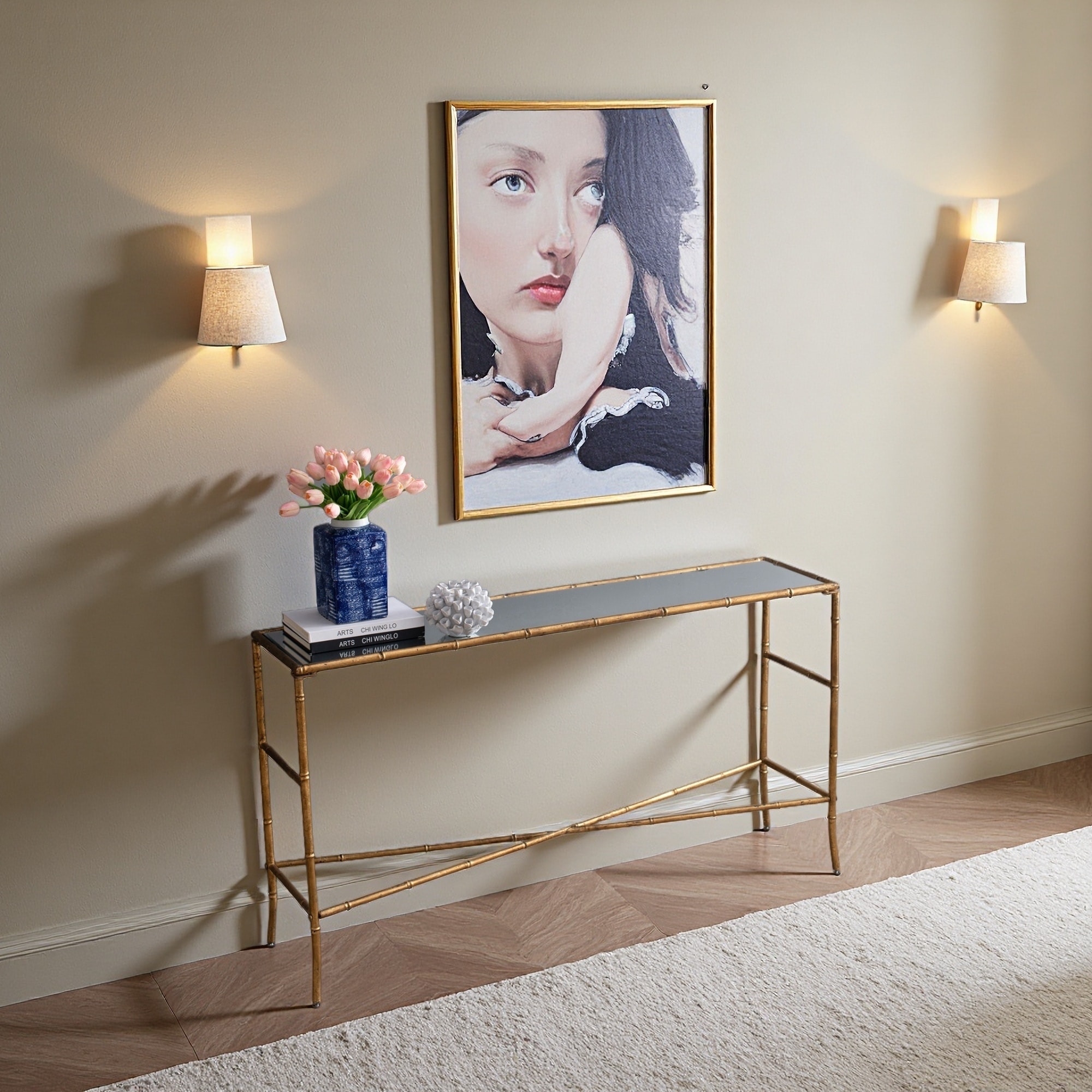 56.5" Antique Gold Console Table with Mirrored Top - Elegant Display Table for Foyer and Office