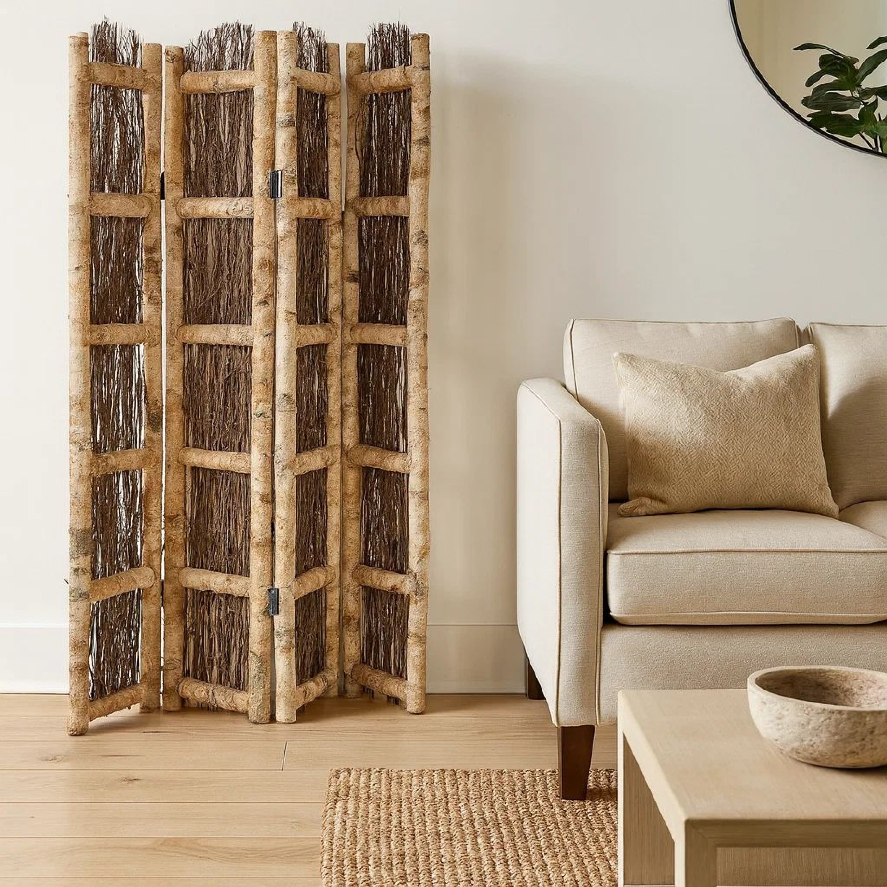 Wooden Foldable Screen with Twig Design 4 Ladder Style Panels, Brown