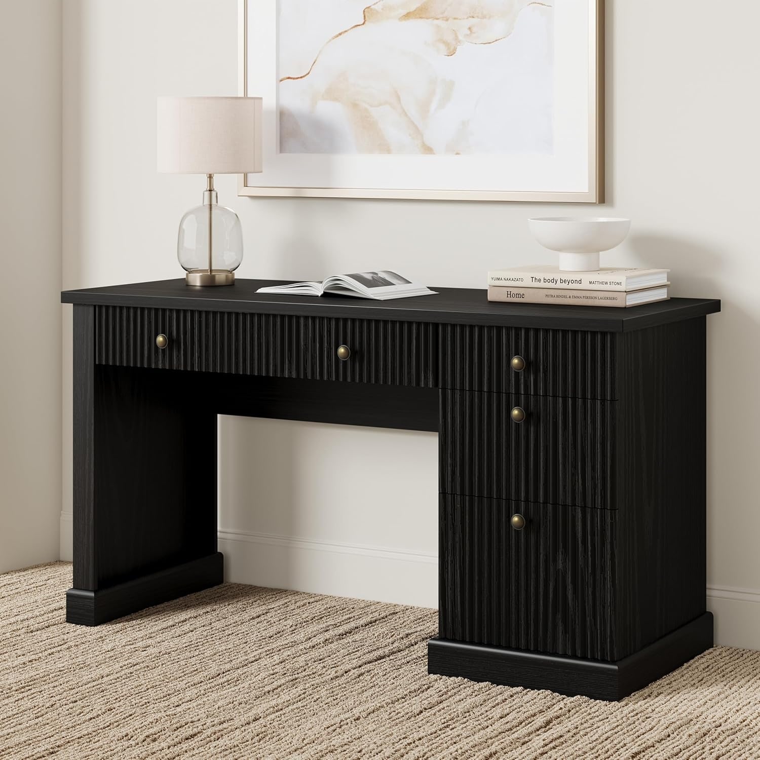 54'' Fluted Home Office Desk with Storage, Modern Executive Desk with Charging Station