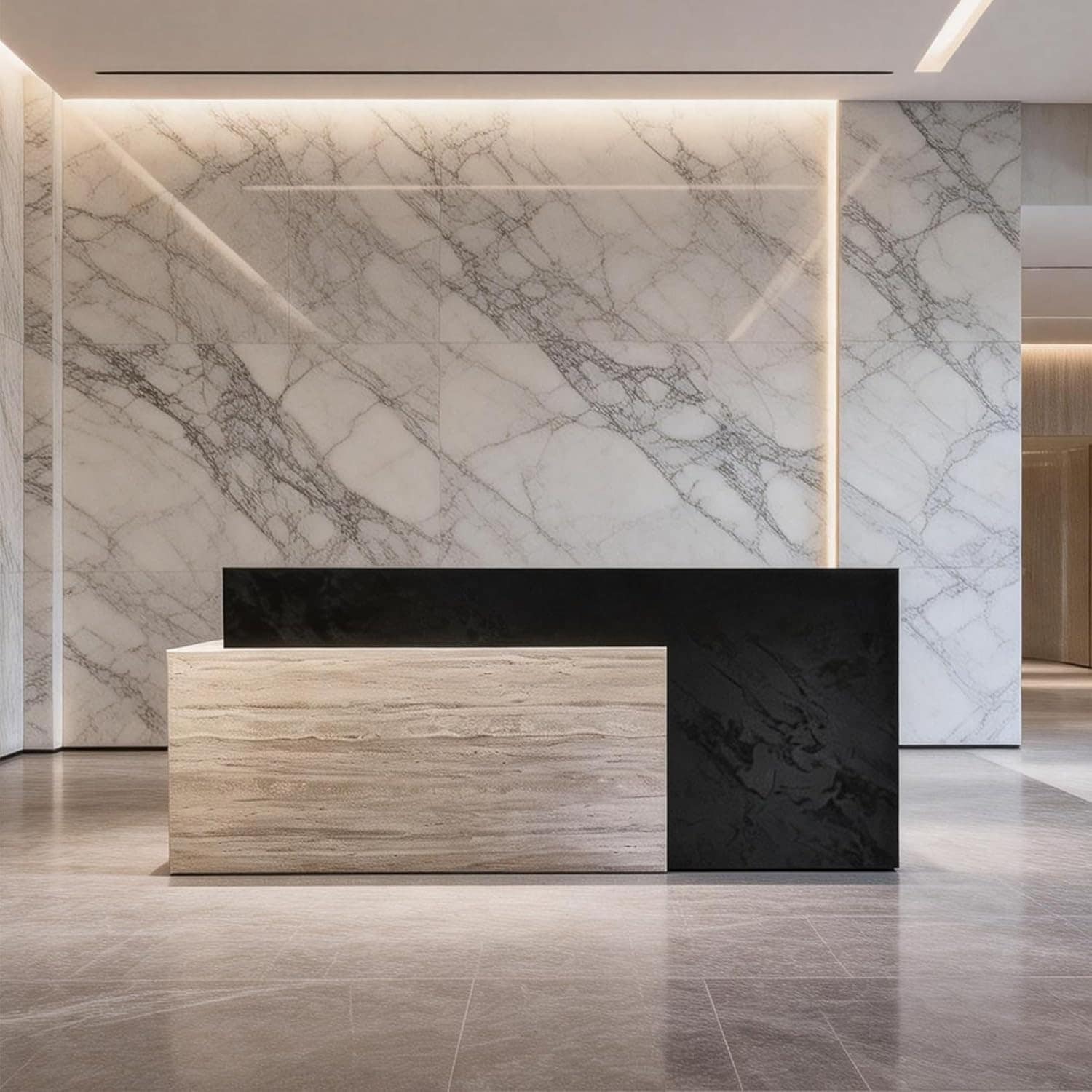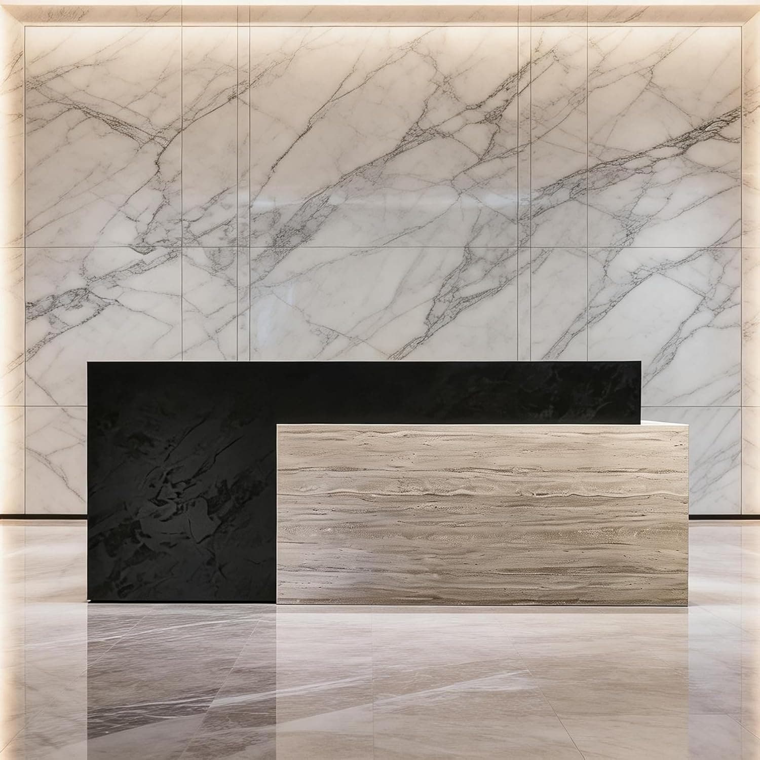 Modern Reception Desk with Black Stone & Travertine Finish Large Reception Counter for Office, Clinic, Lobby