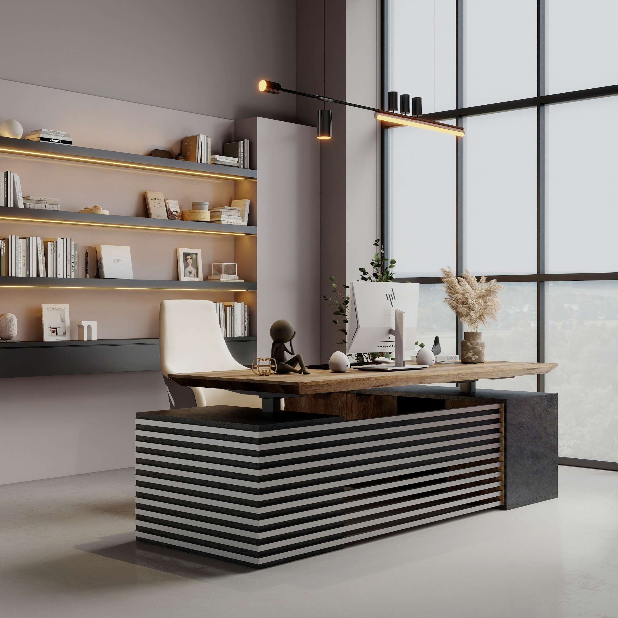 L-Shaped Executive Desk with Outlets File Cabinets 3 Drawers Custom Size & Color